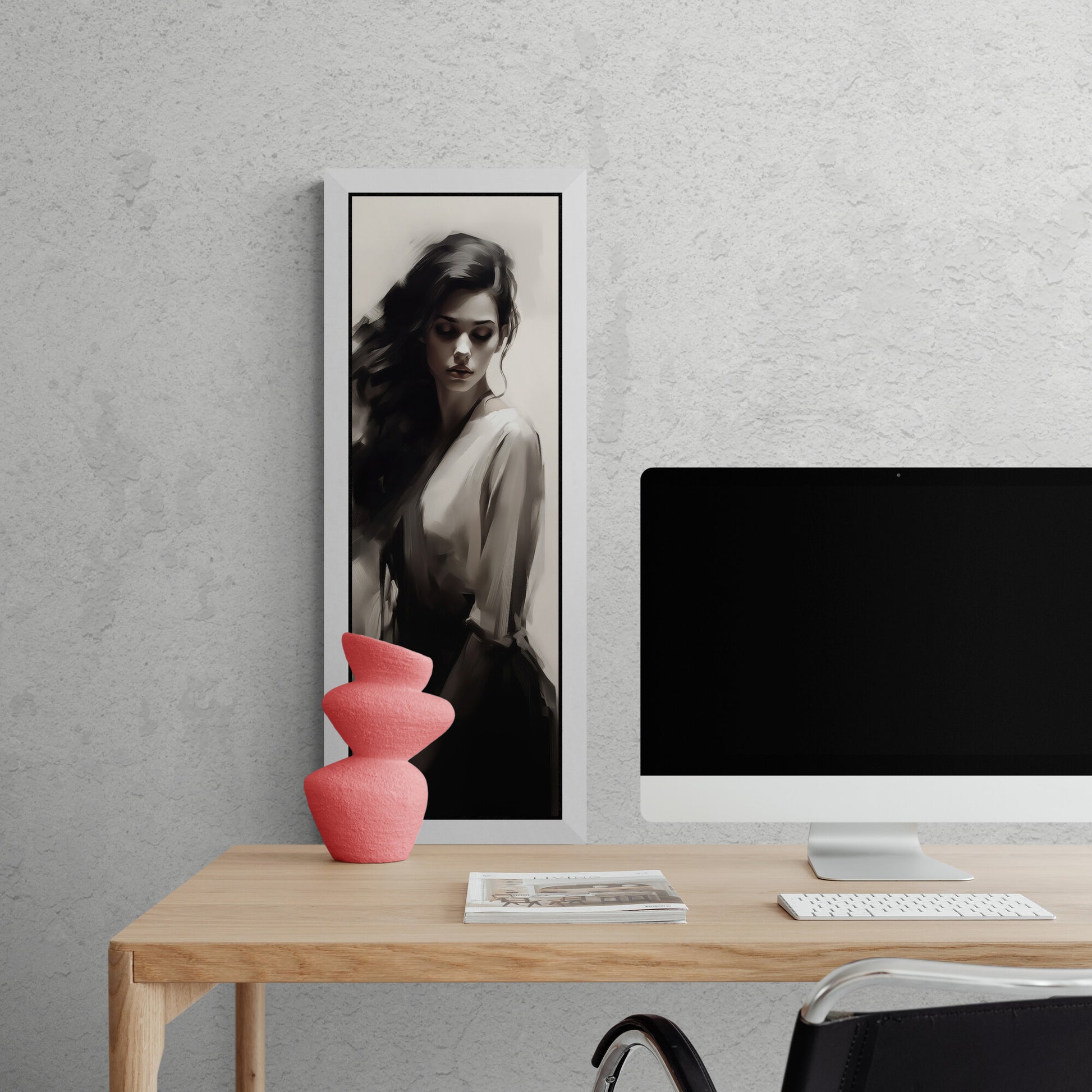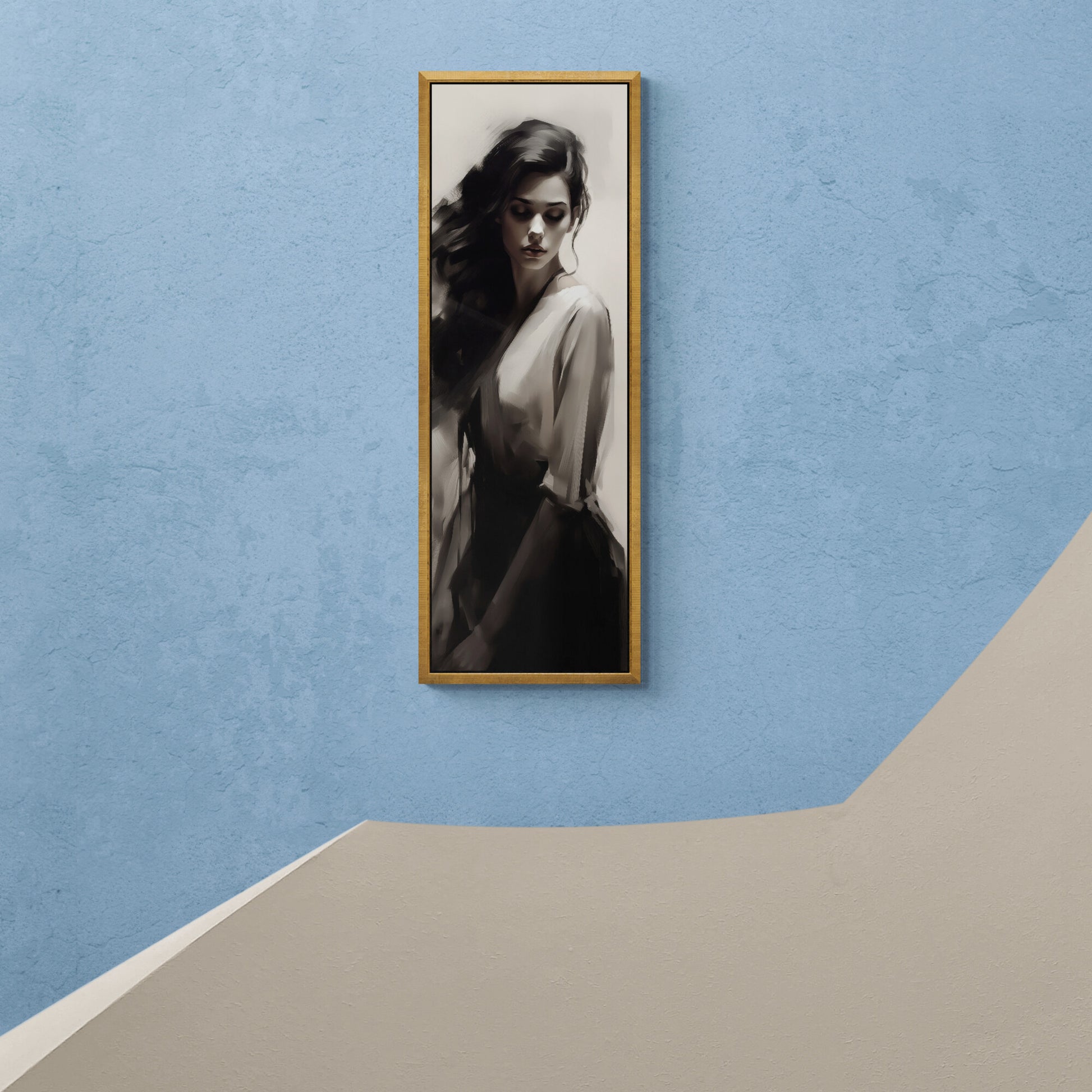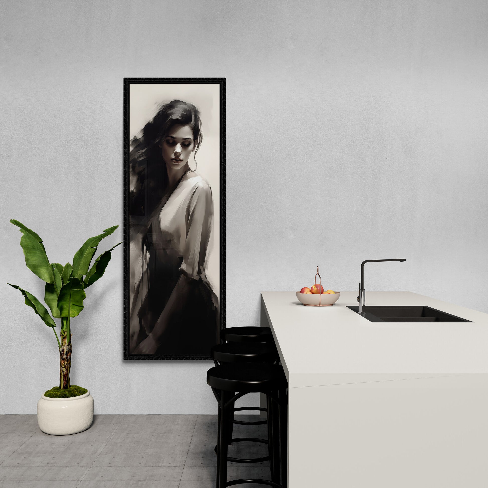 Eine junge Frau mit langen, dunklen Haaren ist in einem monochromen, malerischen Stil dargestellt. Ihr Blick ist gesenkt, der Ausdruck still und nachdenklich. Die Komposition setzt auf weiche Kontraste zwischen Licht und Schatten, wodurch eine zurückhaltende, fast träumerische Atmosphäre entsteht. Die Kleidung wirkt fließend und elegant, der Hintergrund bleibt neutral und lenkt den Fokus vollständig auf das Gesicht und die Haltung der Figur. Die Darstellung erinnert an klassische Porträts, jedoch mit einer modernen, digitalen Ästhetik.