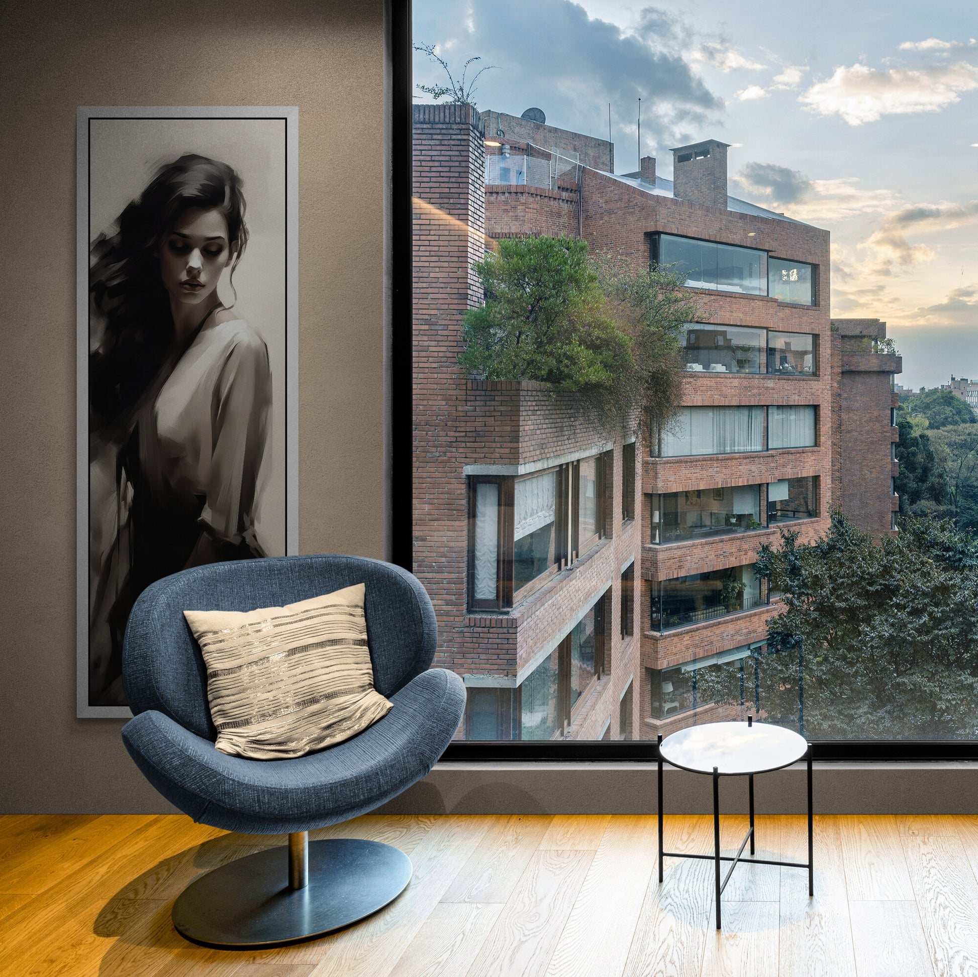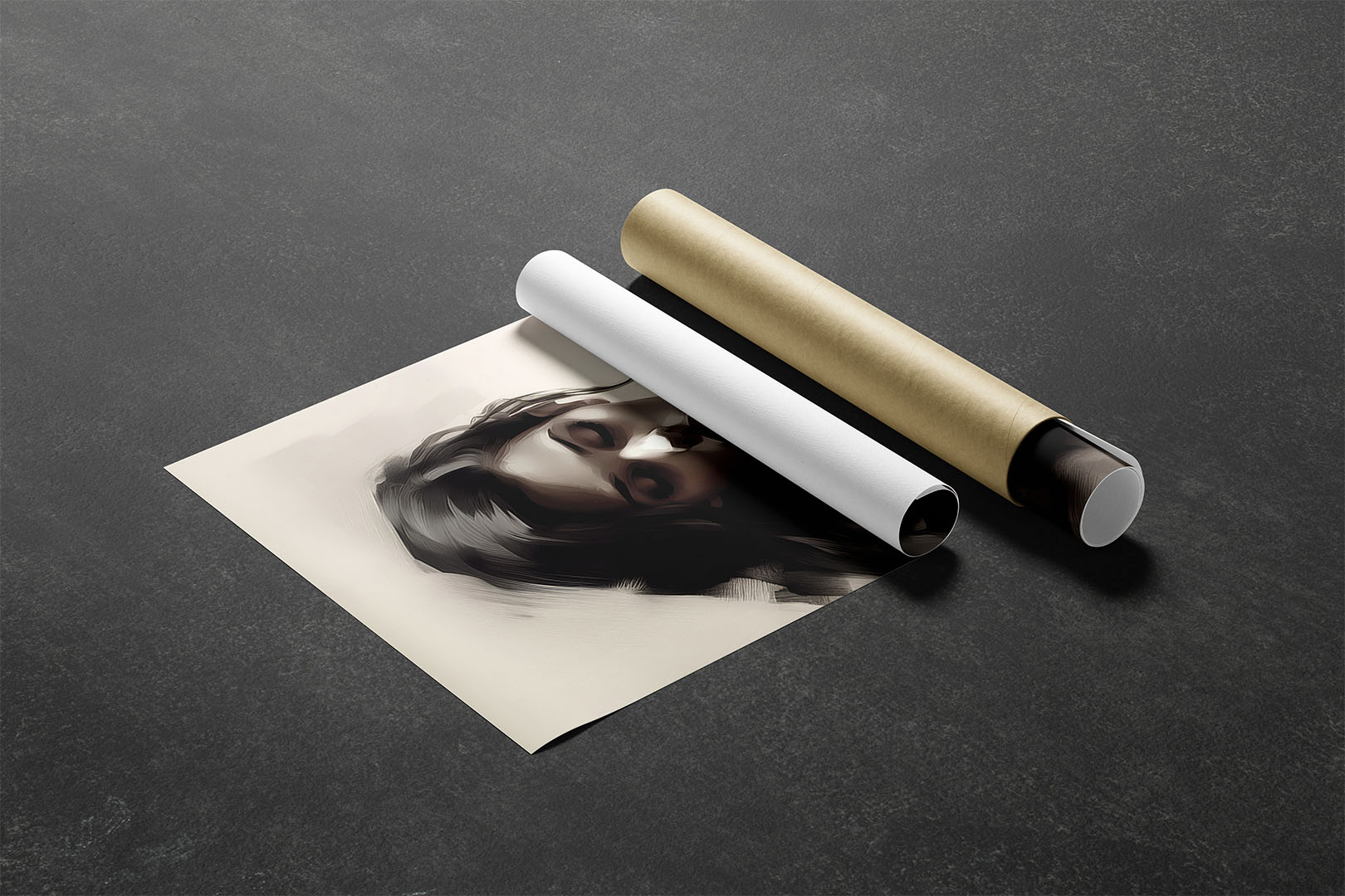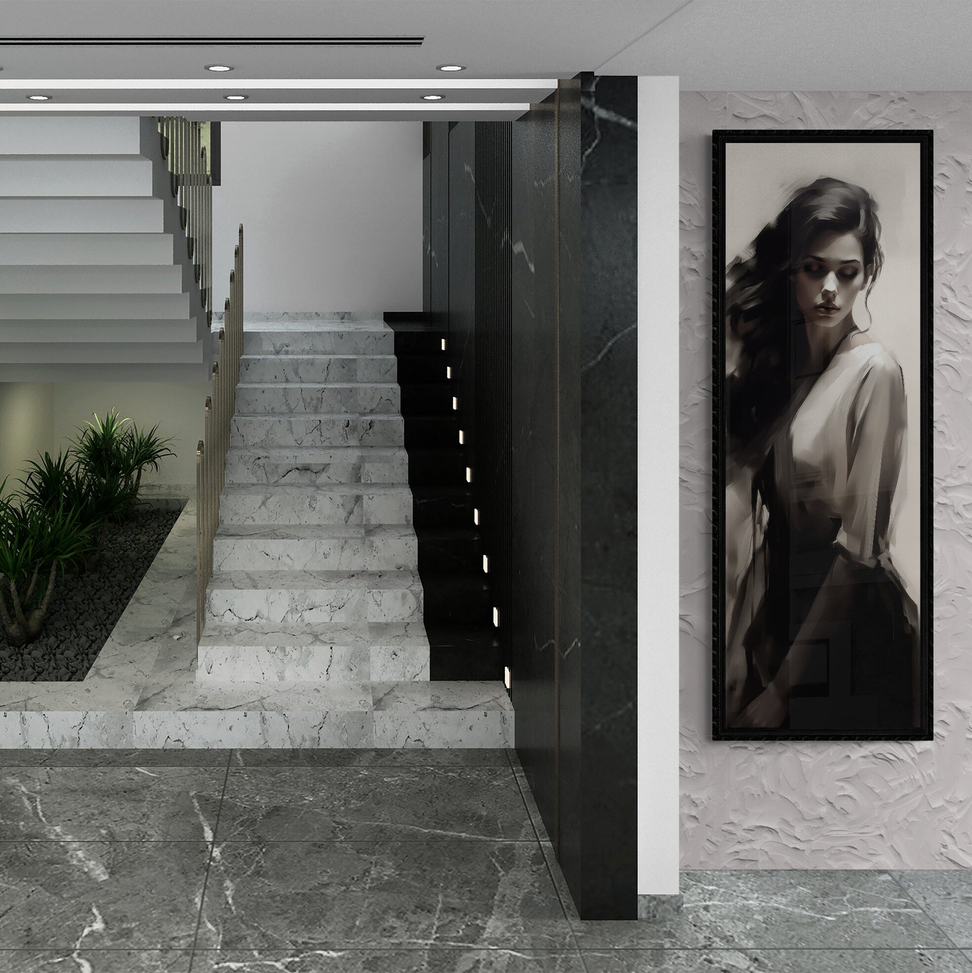 Eine junge Frau mit langen, dunklen Haaren ist in einem monochromen, malerischen Stil dargestellt. Ihr Blick ist gesenkt, der Ausdruck still und nachdenklich. Die Komposition setzt auf weiche Kontraste zwischen Licht und Schatten, wodurch eine zurückhaltende, fast träumerische Atmosphäre entsteht. Die Kleidung wirkt fließend und elegant, der Hintergrund bleibt neutral und lenkt den Fokus vollständig auf das Gesicht und die Haltung der Figur. Die Darstellung erinnert an klassische Porträts, jedoch mit einer modernen, digitalen Ästhetik.