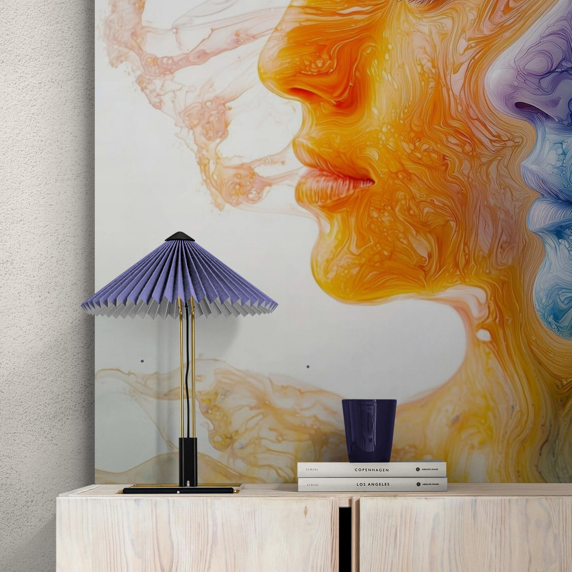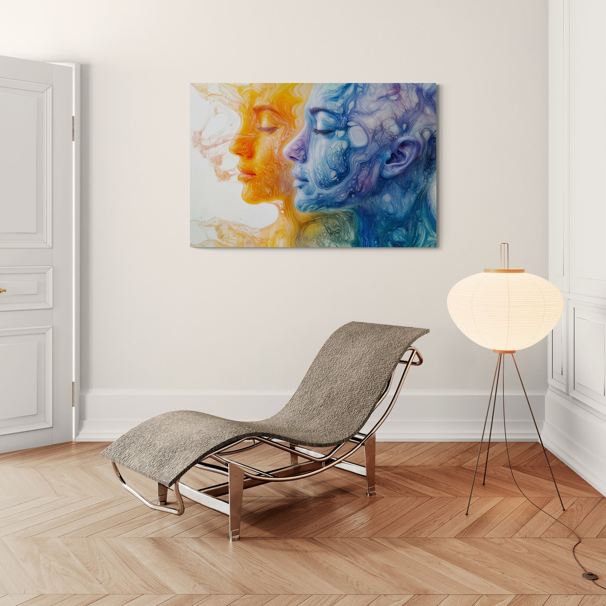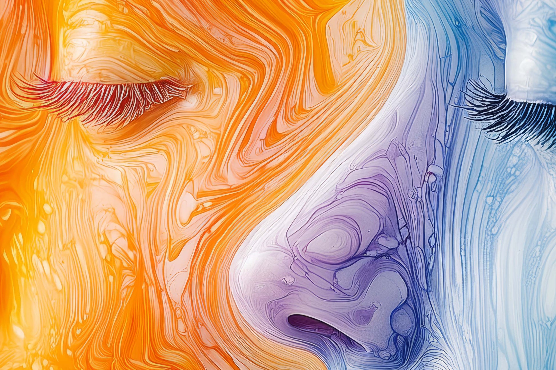 Zwei weibliche Gesichter in Seitenansicht verschmelzen in einer flüssigen, schichtenartigen Komposition im Stil von Fordite. Links dominieren warme Orange- und Gelbtöne, rechts kühle Blau- und Violettnuancen. Die Textur erinnert an polierten Autolack, durchzogen von feinsten Linien und zellartigen Mustern. Beide Gesichter haben geschlossene Augen – ein Bild stiller Zwiesprache und Balance. Diese Edition verbindet Abstraktion, Eleganz und Tiefe auf außergewöhnliche Weise.