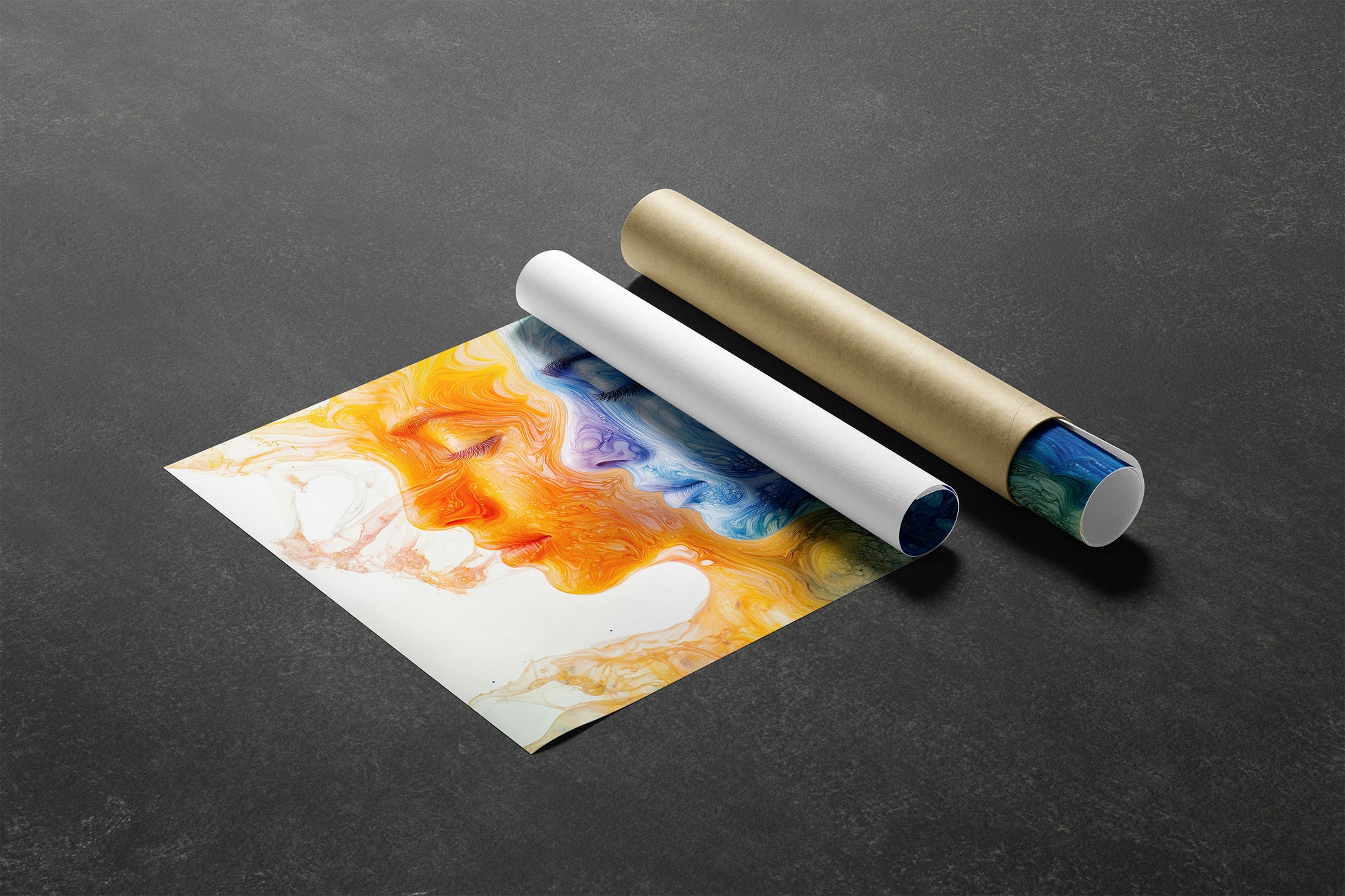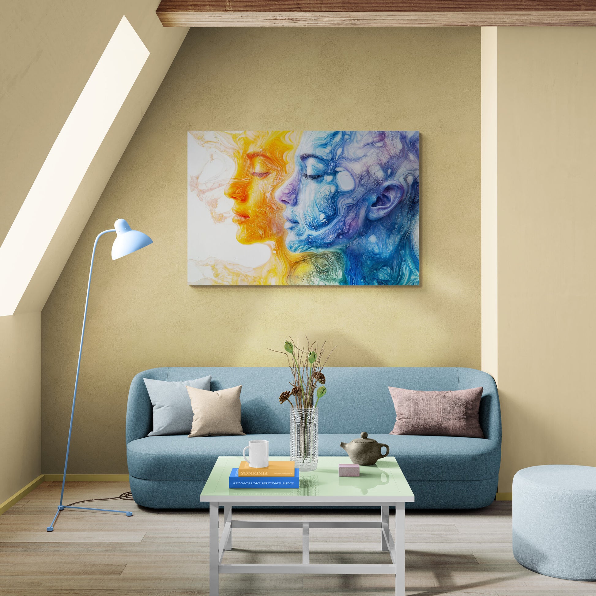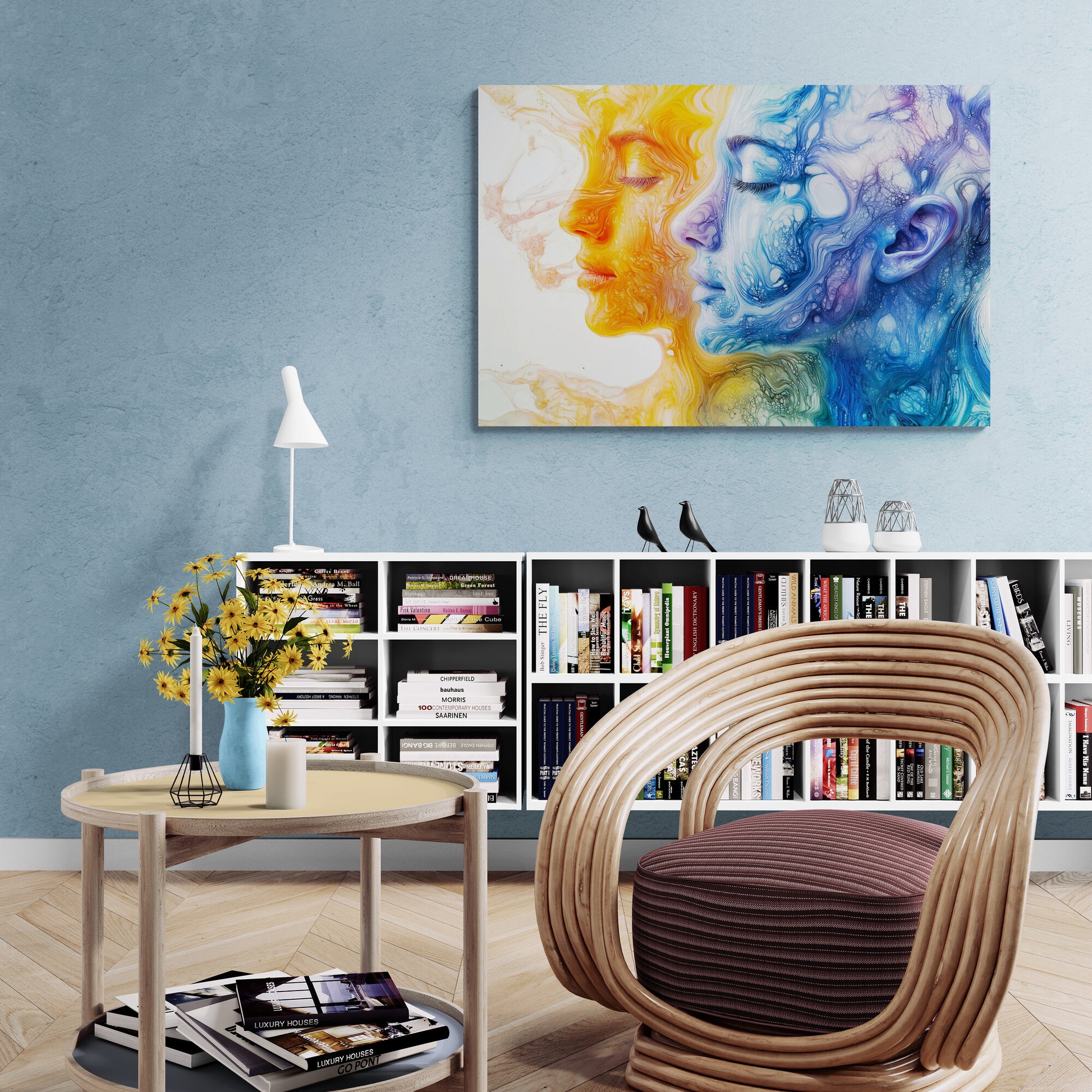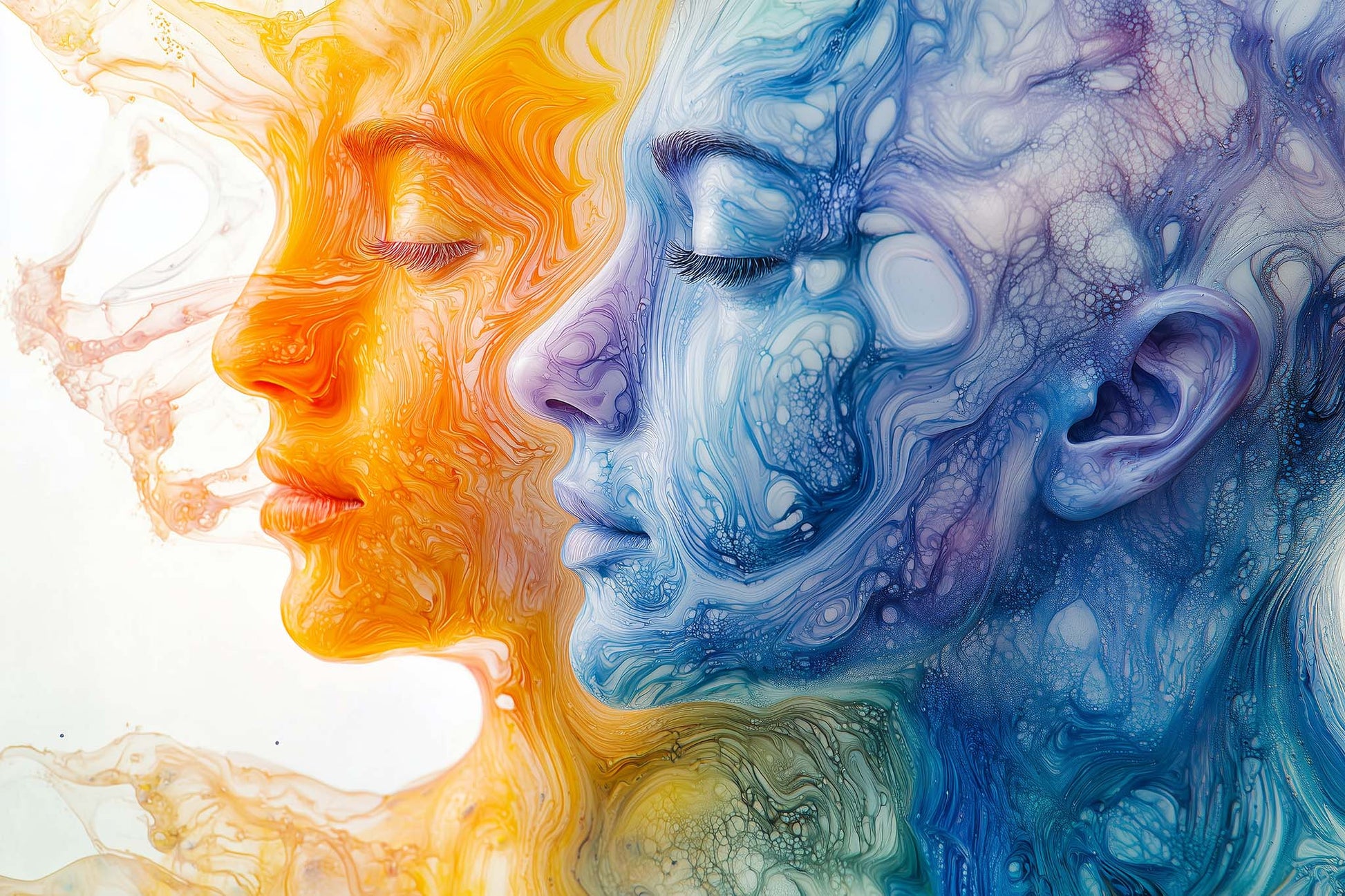 Zwei weibliche Gesichter in Seitenansicht verschmelzen in einer flüssigen, schichtenartigen Komposition im Stil von Fordite. Links dominieren warme Orange- und Gelbtöne, rechts kühle Blau- und Violettnuancen. Die Textur erinnert an polierten Autolack, durchzogen von feinsten Linien und zellartigen Mustern. Beide Gesichter haben geschlossene Augen – ein Bild stiller Zwiesprache und Balance. Diese Edition verbindet Abstraktion, Eleganz und Tiefe auf außergewöhnliche Weise.