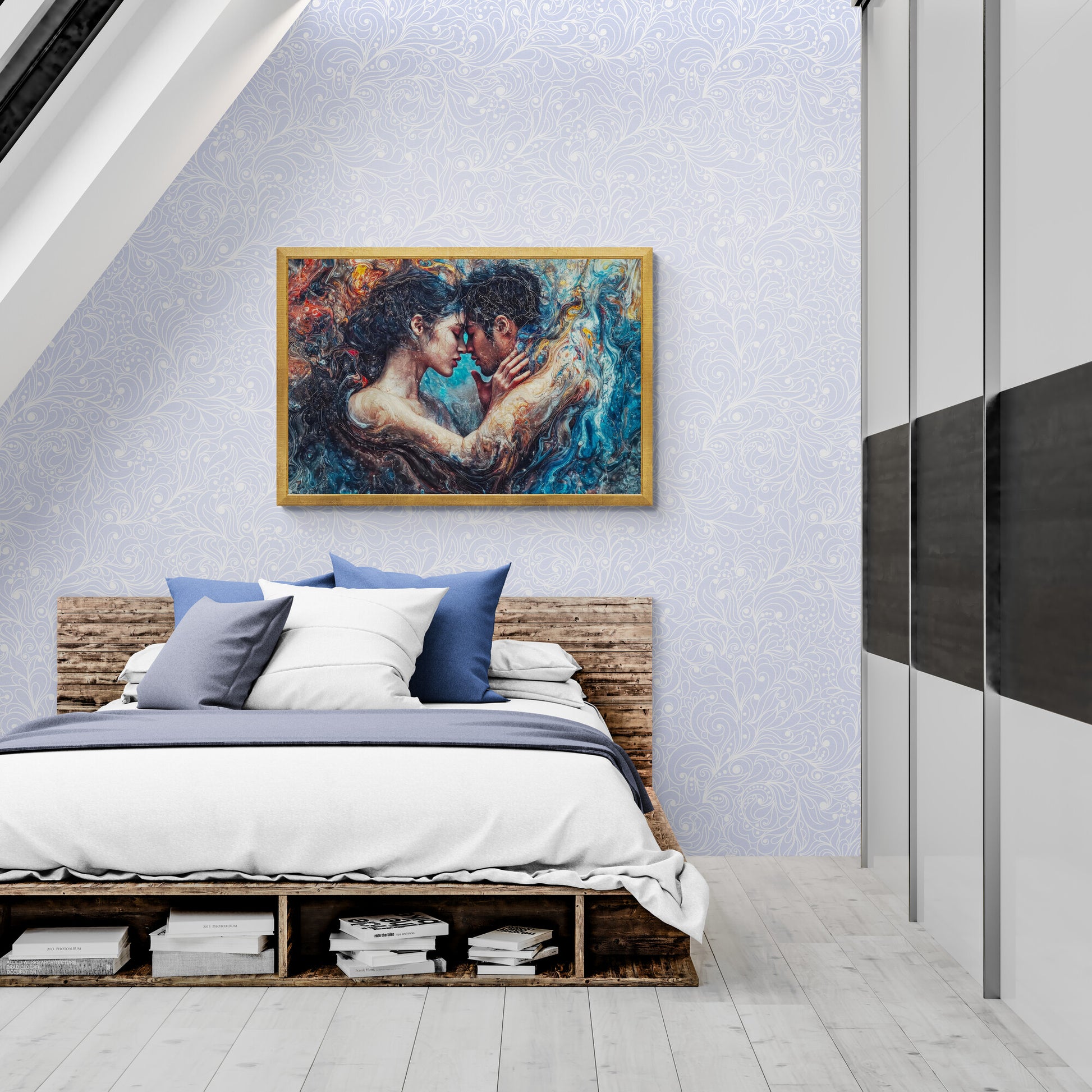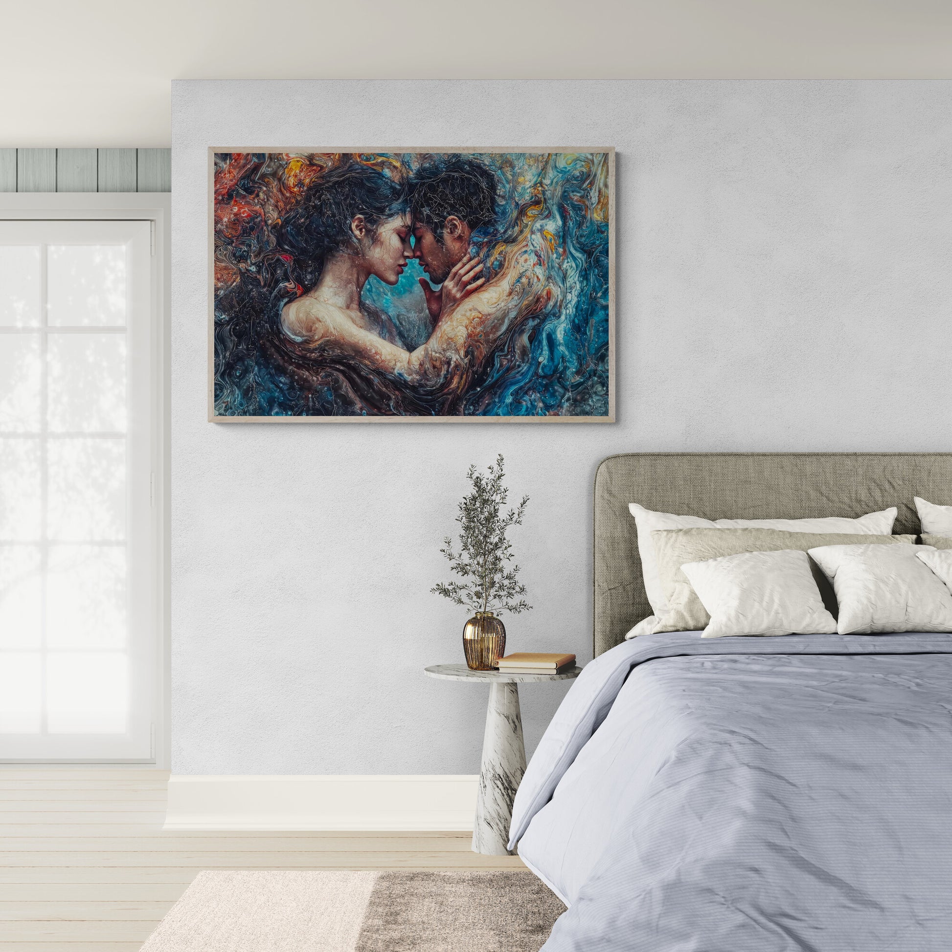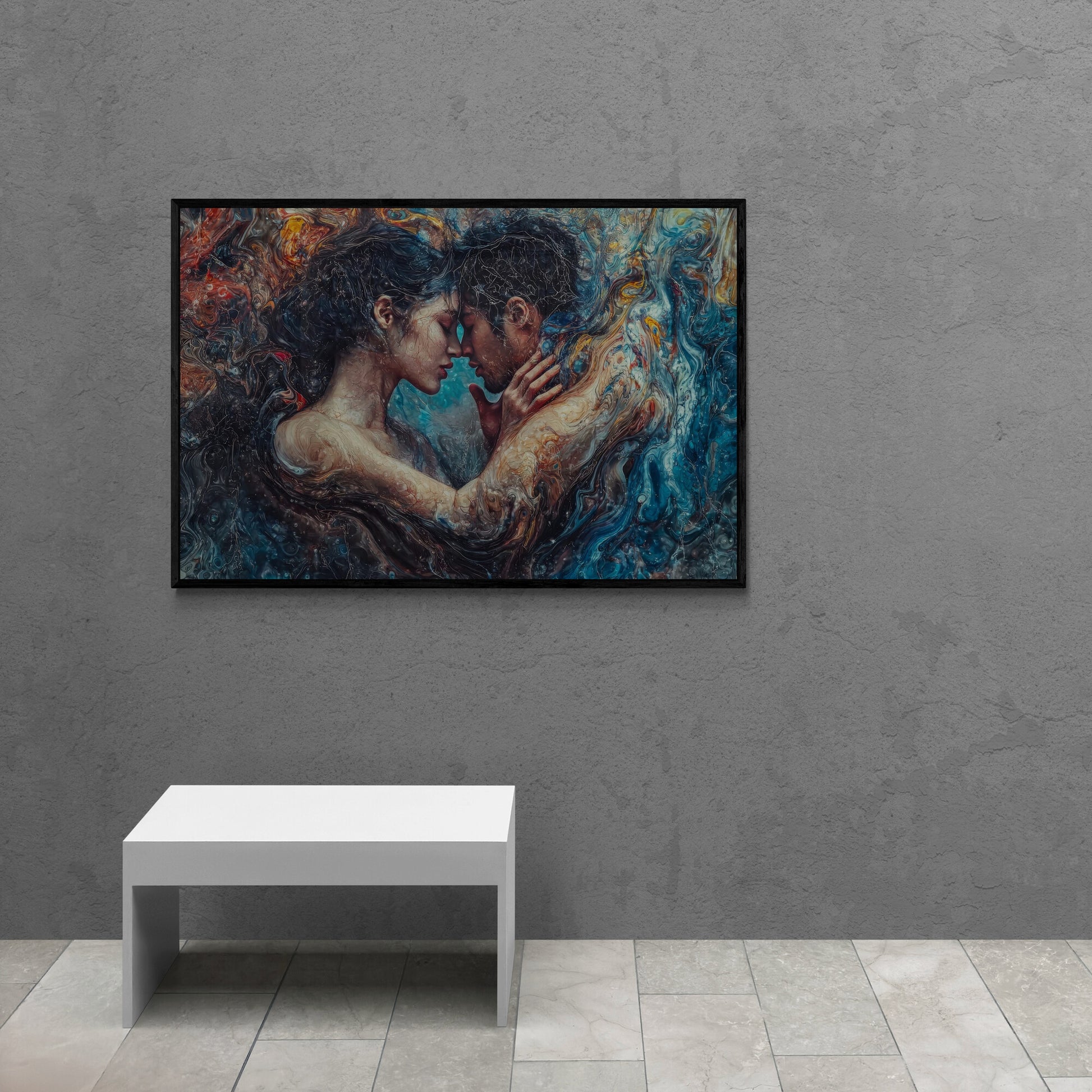 Ein leidenschaftliches Liebespaar steht sich Stirn an Stirn gegenüber. Ihre Körper verschmelzen scheinbar mit einem flüssigen Farbwirbel aus Blau, Gold, Rot und Schwarz. Die Szene wirkt wie in Öl gegossen, wobei jede Bewegung im Hintergrund in wirbelnder Struktur festgehalten ist. Haut, Haare und Emotionen lösen sich im Strudel der Farben auf, bleiben aber dennoch greifbar. Der Moment ist intim und voller Spannung – ein stiller Höhepunkt emotionaler Nähe.