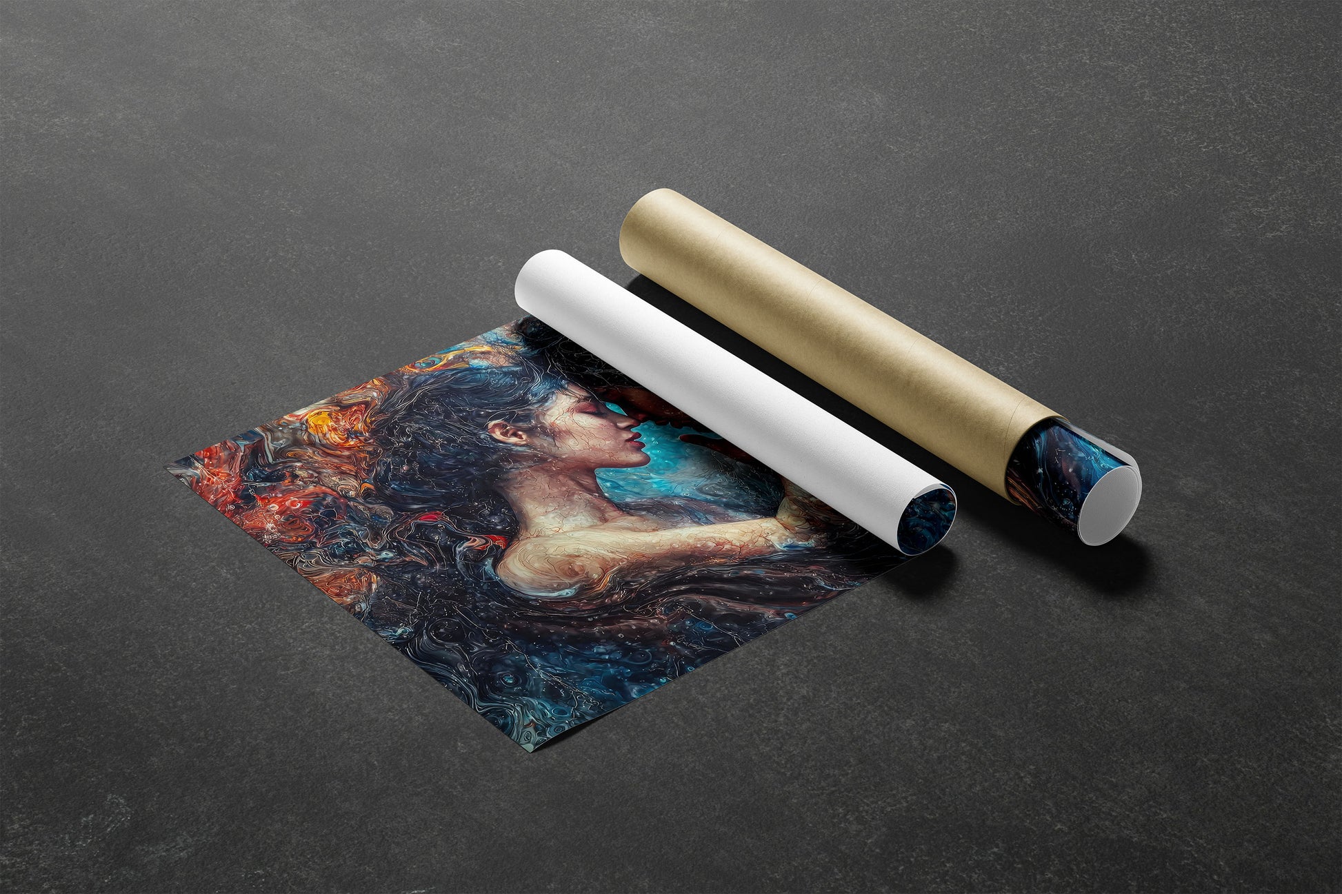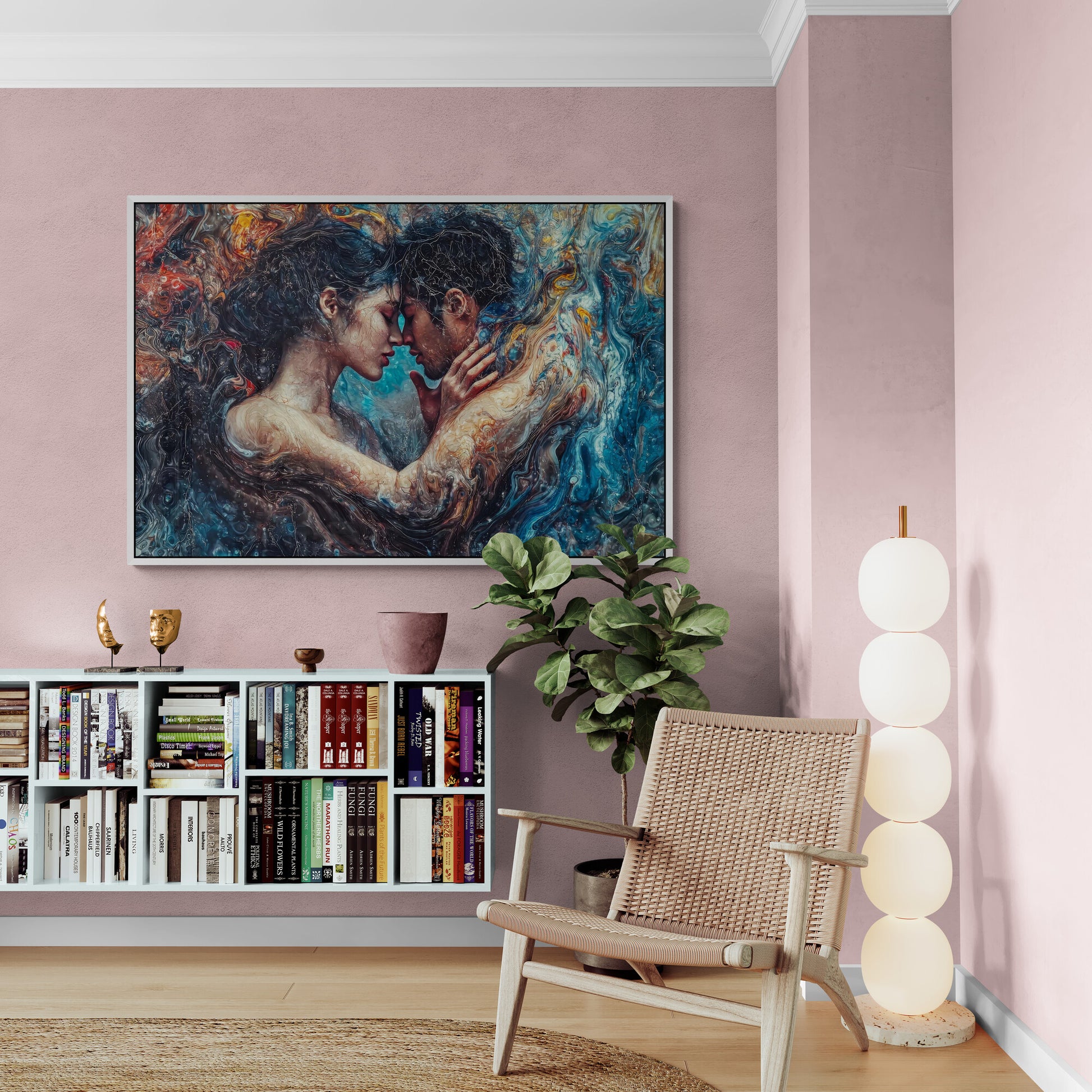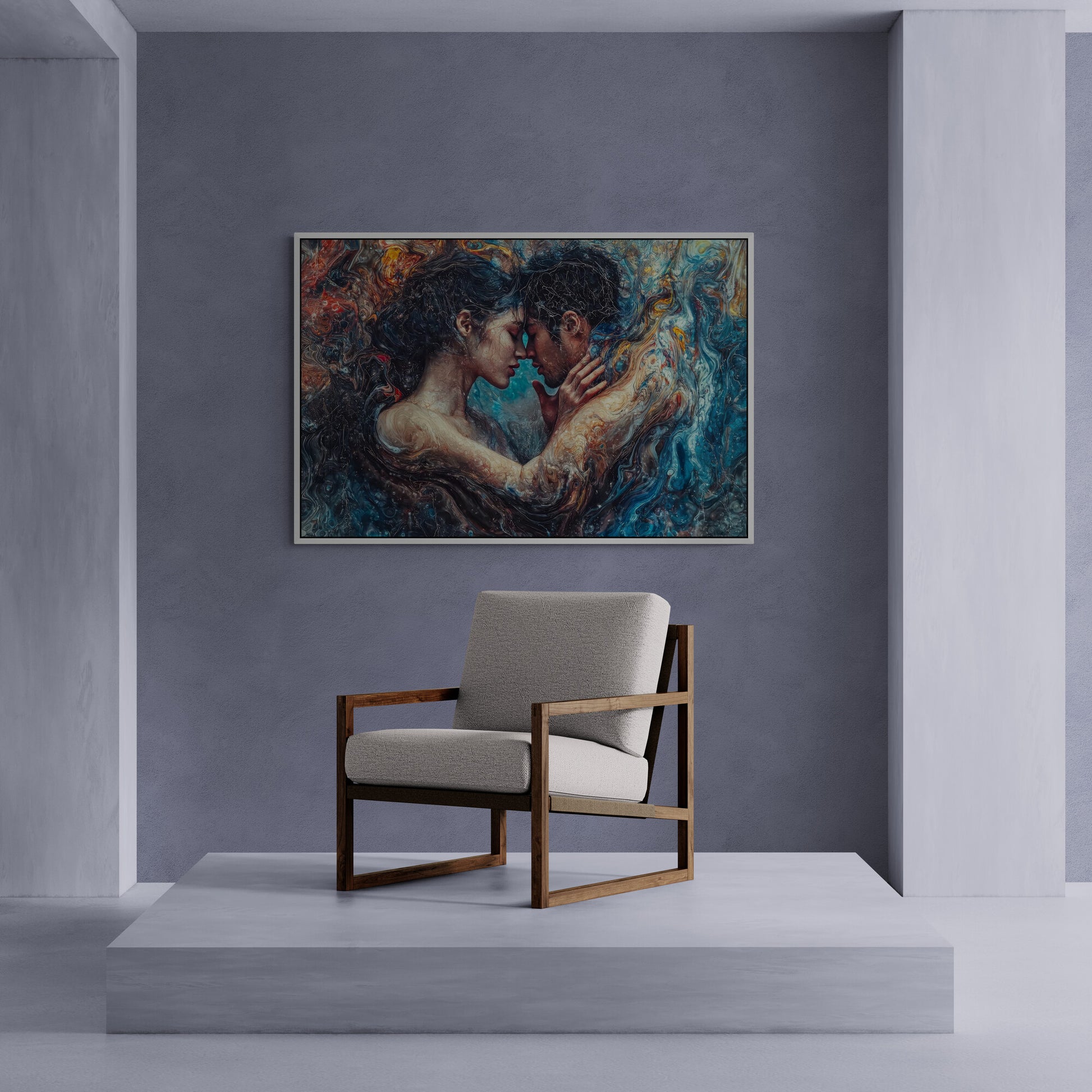 Ein leidenschaftliches Liebespaar steht sich Stirn an Stirn gegenüber. Ihre Körper verschmelzen scheinbar mit einem flüssigen Farbwirbel aus Blau, Gold, Rot und Schwarz. Die Szene wirkt wie in Öl gegossen, wobei jede Bewegung im Hintergrund in wirbelnder Struktur festgehalten ist. Haut, Haare und Emotionen lösen sich im Strudel der Farben auf, bleiben aber dennoch greifbar. Der Moment ist intim und voller Spannung – ein stiller Höhepunkt emotionaler Nähe.