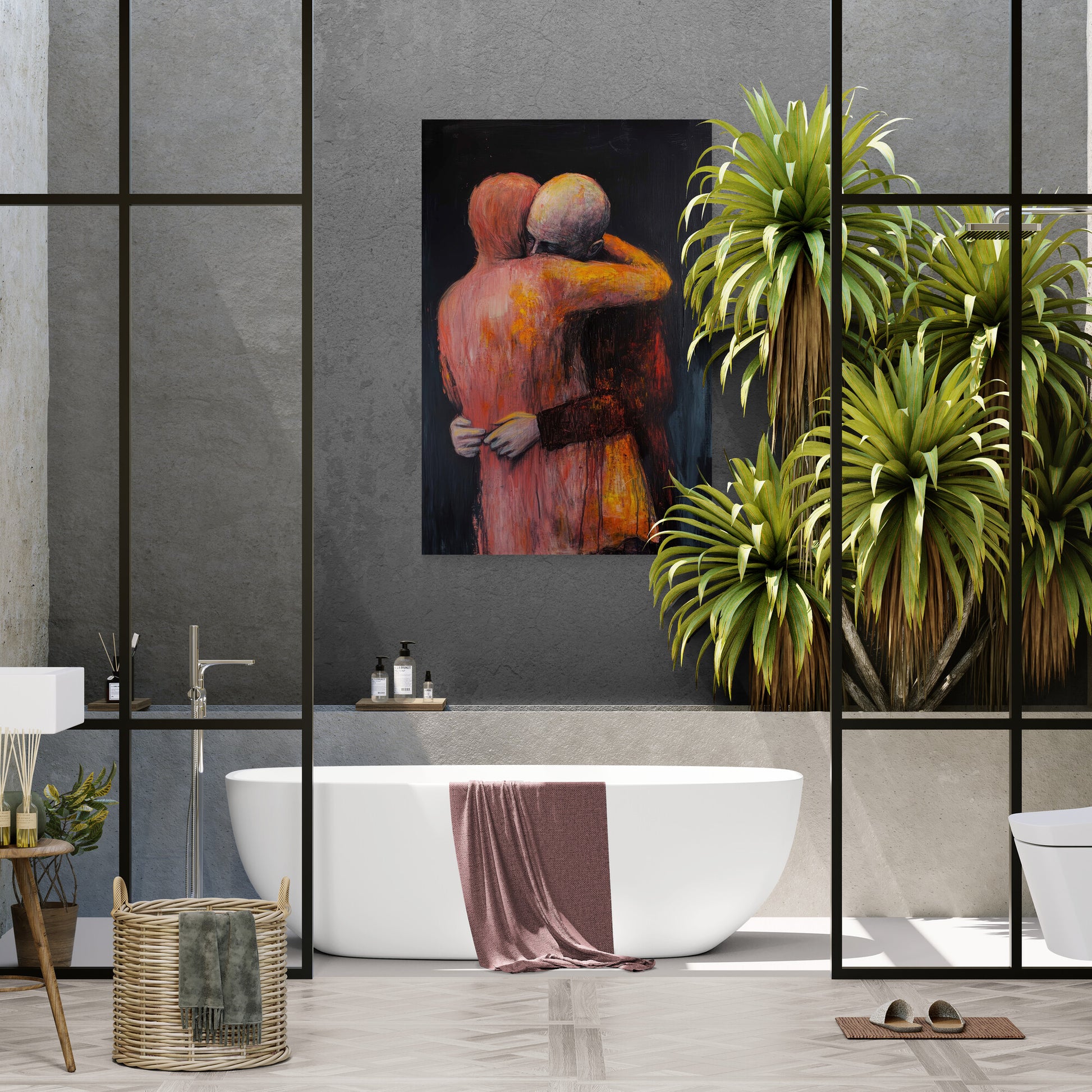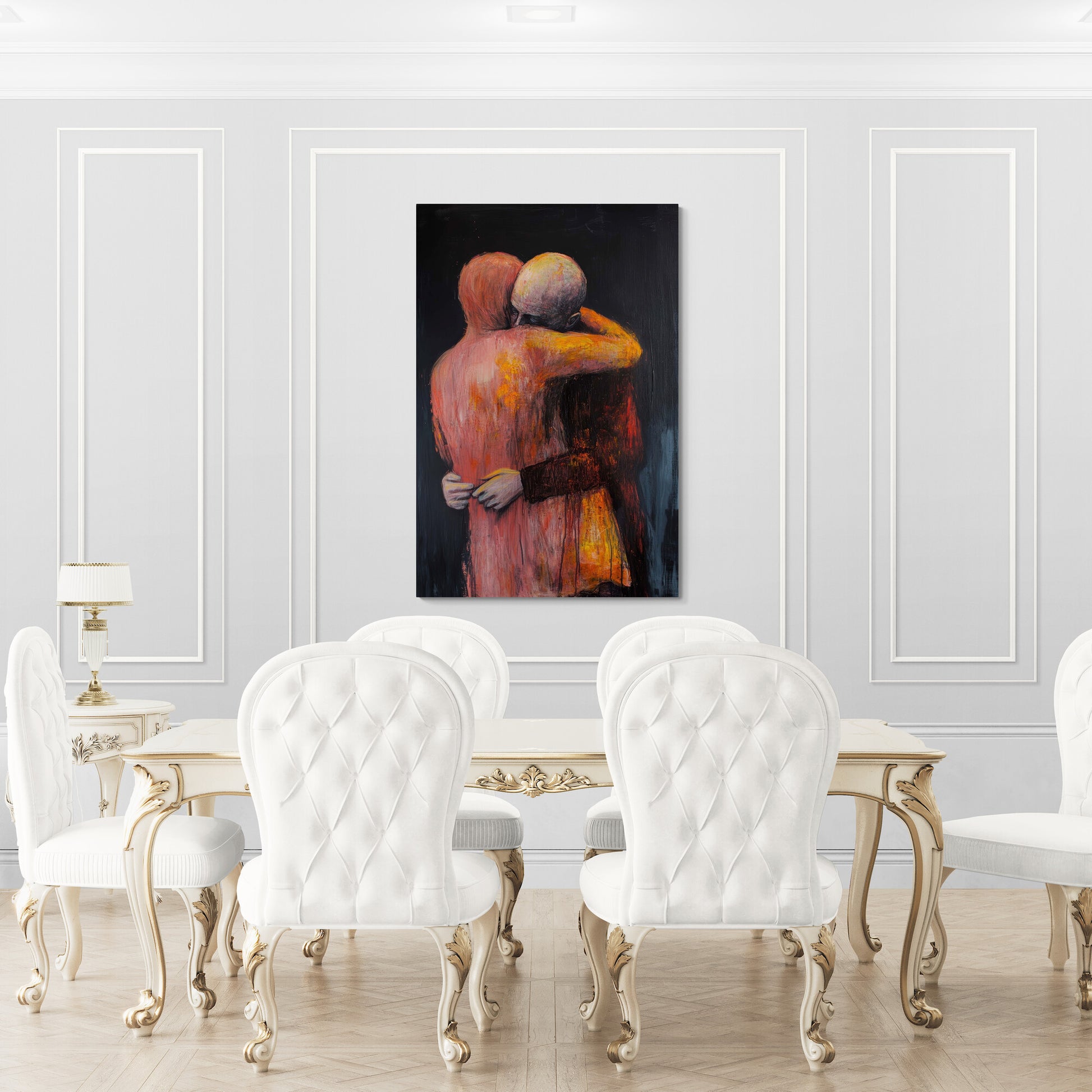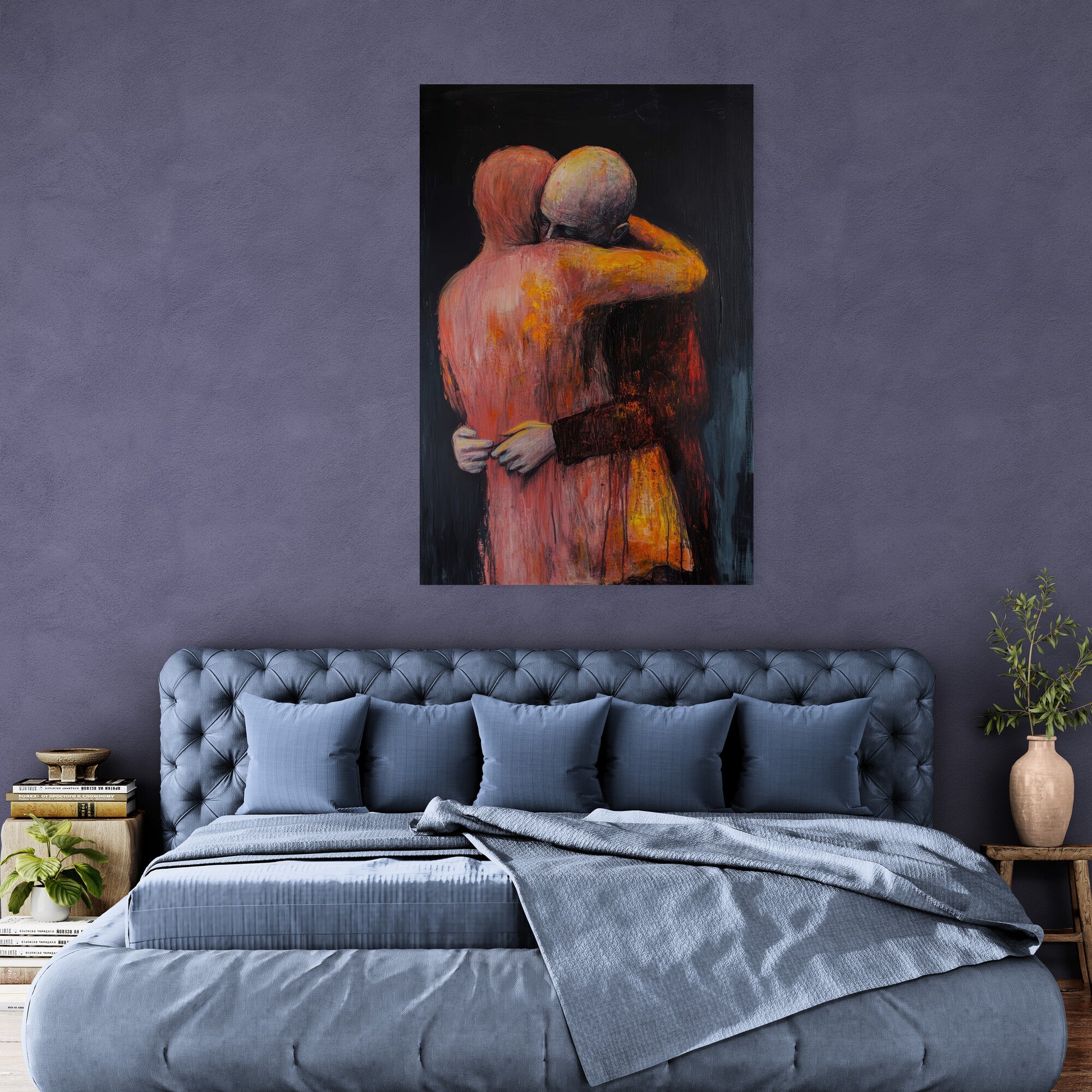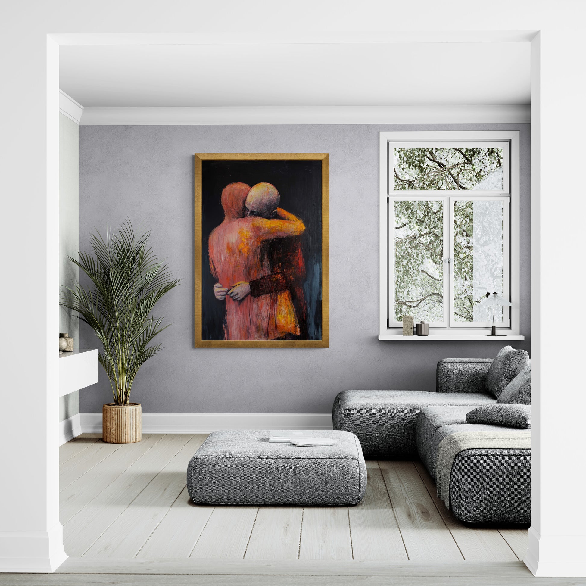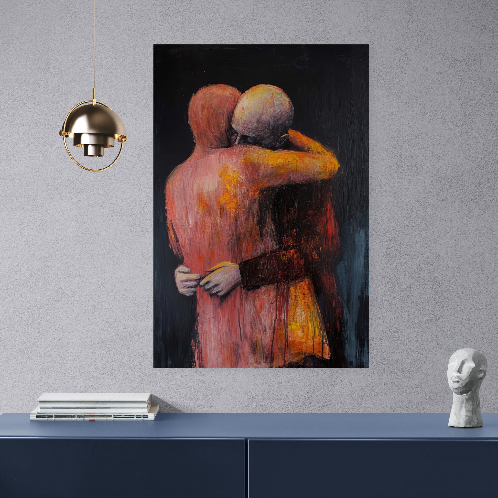 Zwei Figuren umarmen sich innig auf dunklem Hintergrund. Die Körper sind roh, fast skizzenhaft dargestellt, in kräftigen Tönen aus Orange, Rot, Rosa und Schwarz. Die linke Person ist vollständig vom Rücken zu sehen, ihre Haltung wirkt verletzlich. Die rechte Figur drückt ihr Gesicht an die Schulter des anderen, die Augen geschlossen. Die Pinselschläge sind expressiv, die Farben wirken wie aufgetragen und verlaufen – ein Eindruck von Schmerz, Trost und Intimität zugleich. Das Werk wirkt wie ein emotionaler Stillstand inmitten der Dunkelheit.