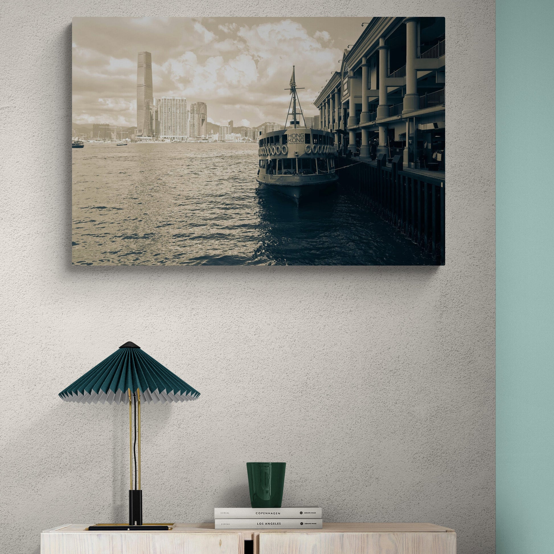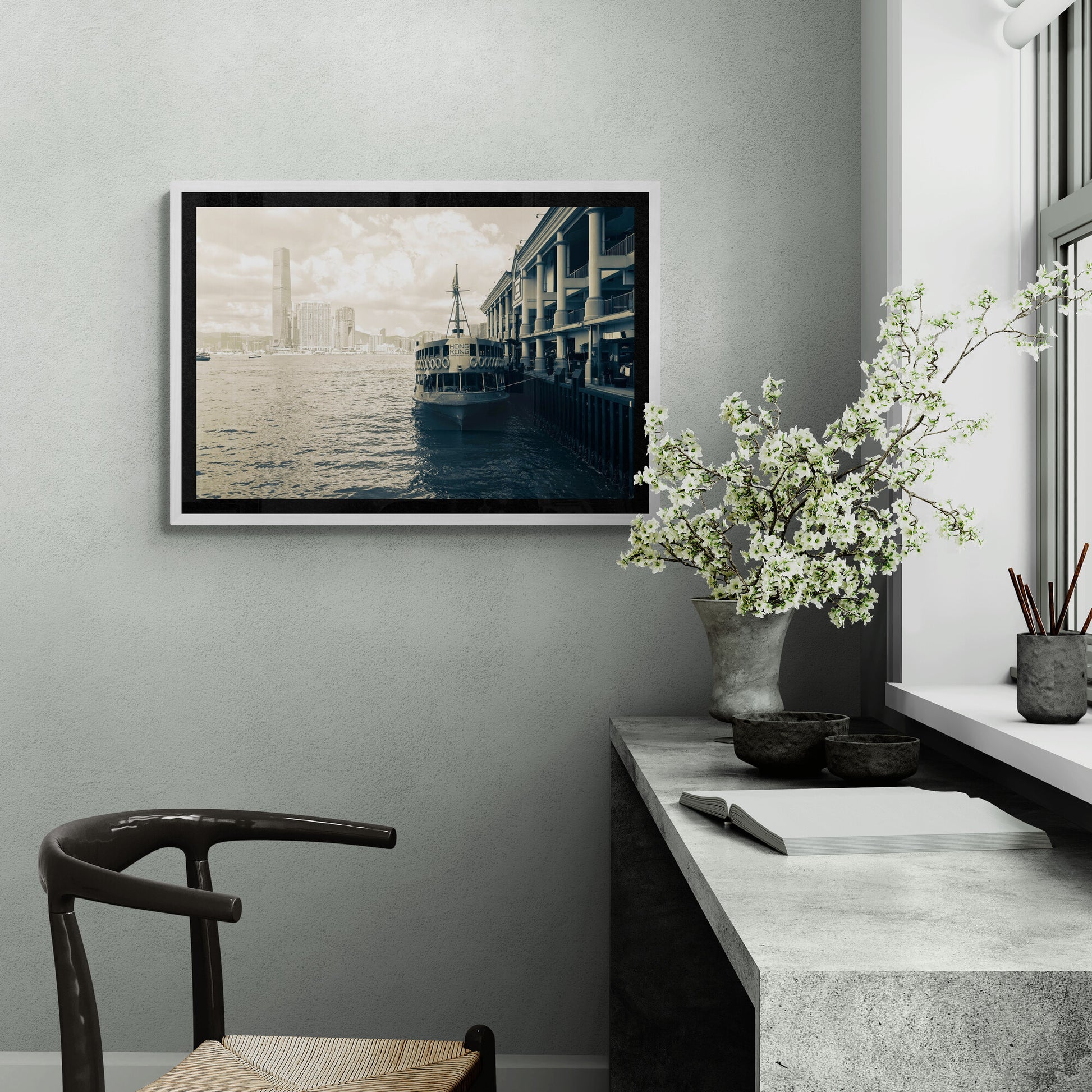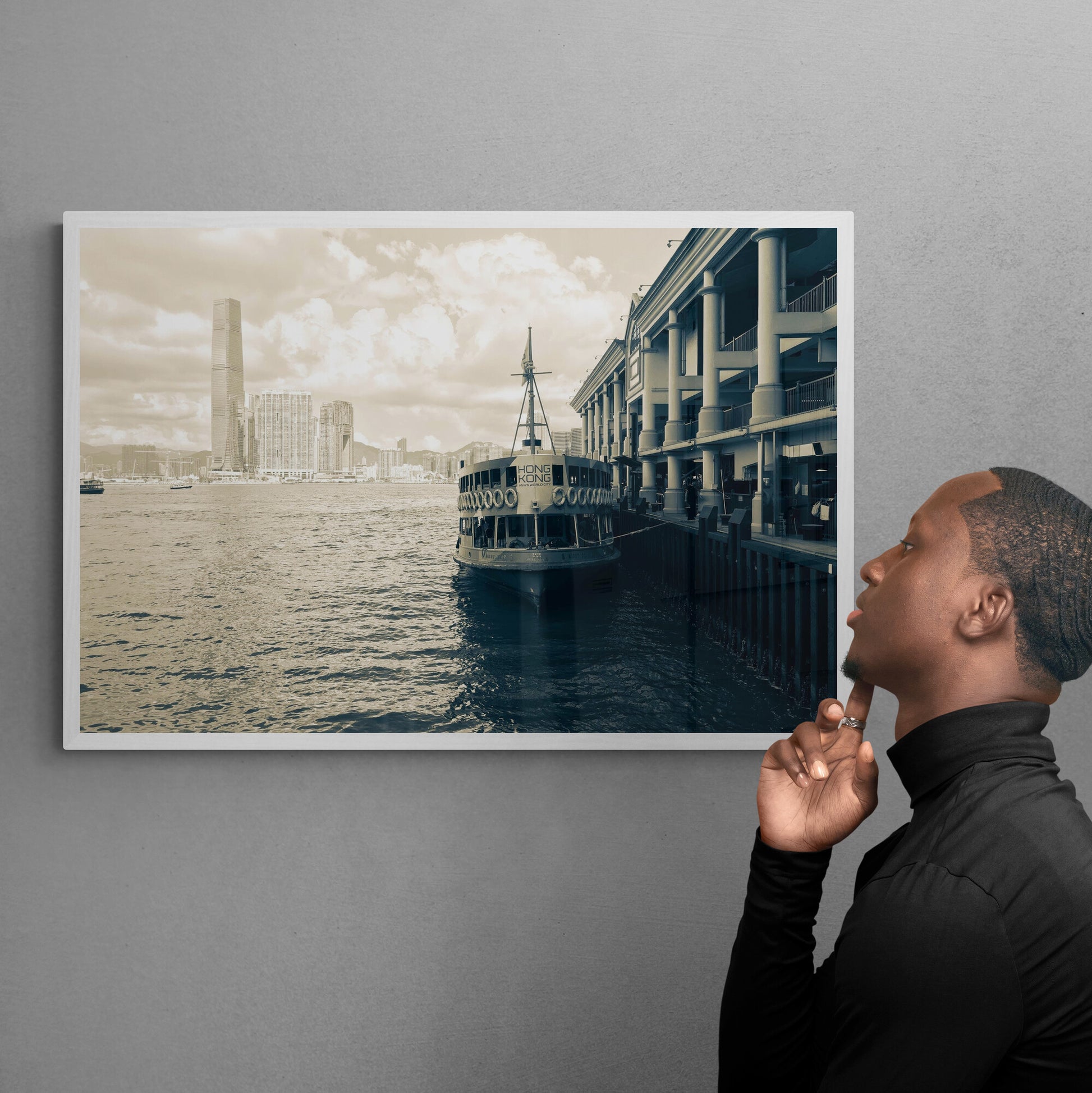 Das Foto zeigt eine klassische Hongkonger Star Ferry, die am Anleger des Central Ferry Piers festgemacht ist. Das Schiff liegt im rechten Vordergrund, direkt vor dem markanten Säulenbau des Fährterminals. Im Hintergrund erstreckt sich die Skyline von Kowloon mit dem International Commerce Centre (ICC) als dominierendem Hochhaus. Das Bild ist in einem monochromen Sepia-Ton gehalten, was ihm eine zeitlose, dokumentarische Anmutung verleiht. Die Wasseroberfläche ist ruhig, der Himmel teils bewölkt, teils sonnig.