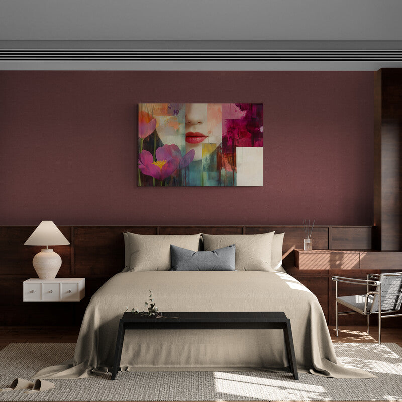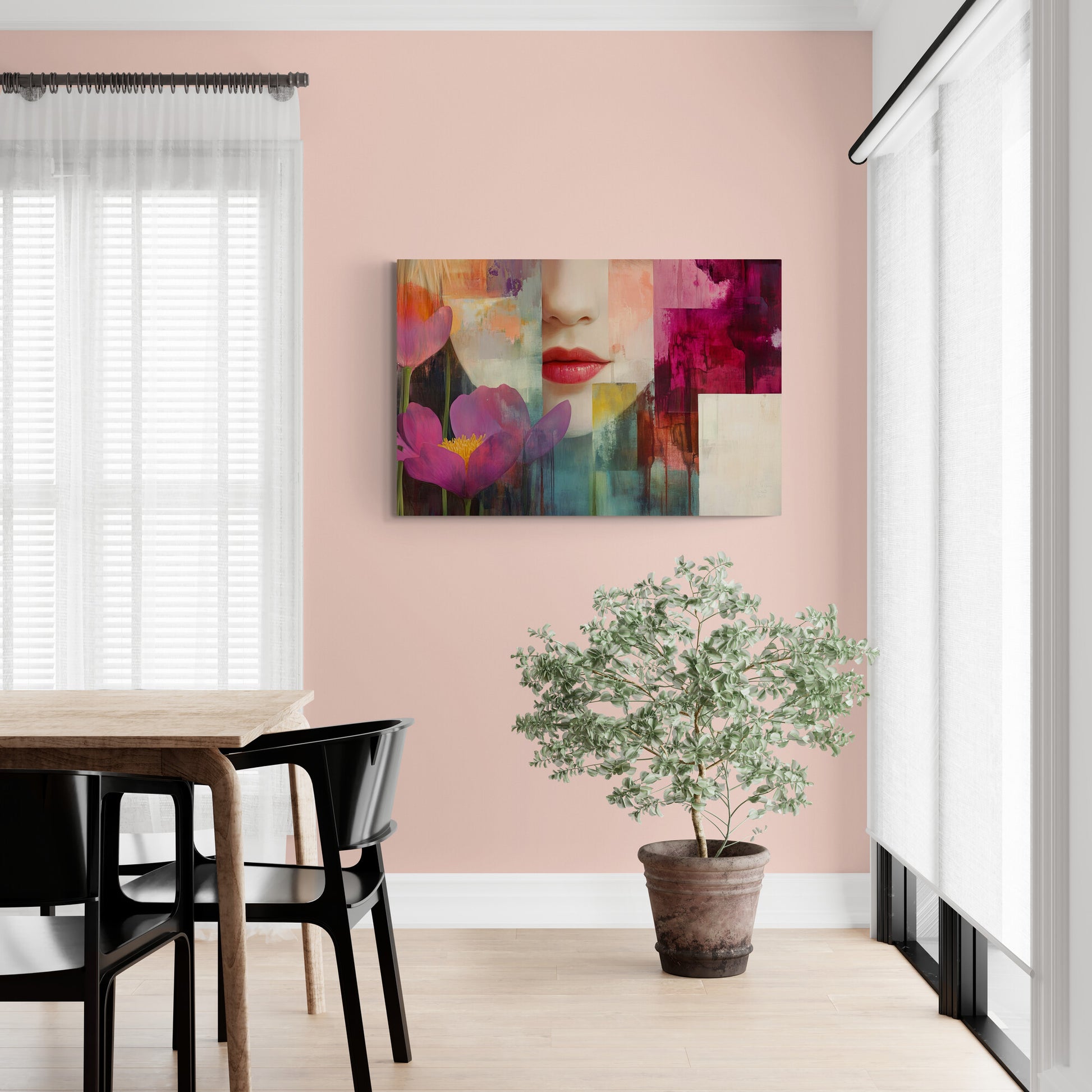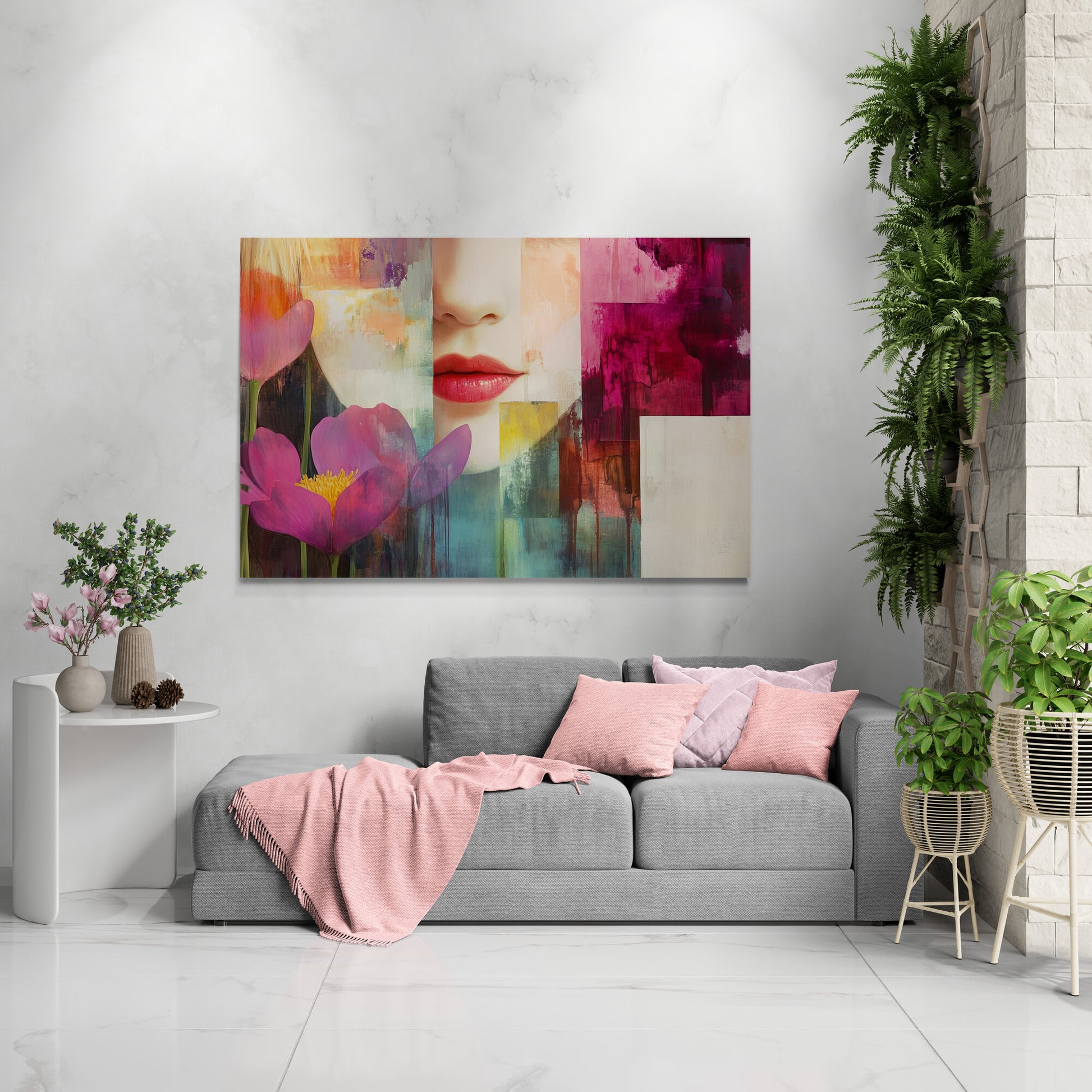 Ein fragmentiertes Porträt einer Frau, bei dem nur Nase und rote Lippen sichtbar sind, verschmilzt mit abstrakten Farbflächen und floralen Elementen. Die Komposition ist eine Kombination aus digitaler Malerei und Collage-Technik. Dominant sind kräftige Rosa-, Rot- und Violetttöne, kontrastiert von türkisgrünen und gelblichen Strukturen. Drei blühende Mohnblumen im Vordergrund unterstreichen die sinnliche, fast träumerische Atmosphäre des Bildes.