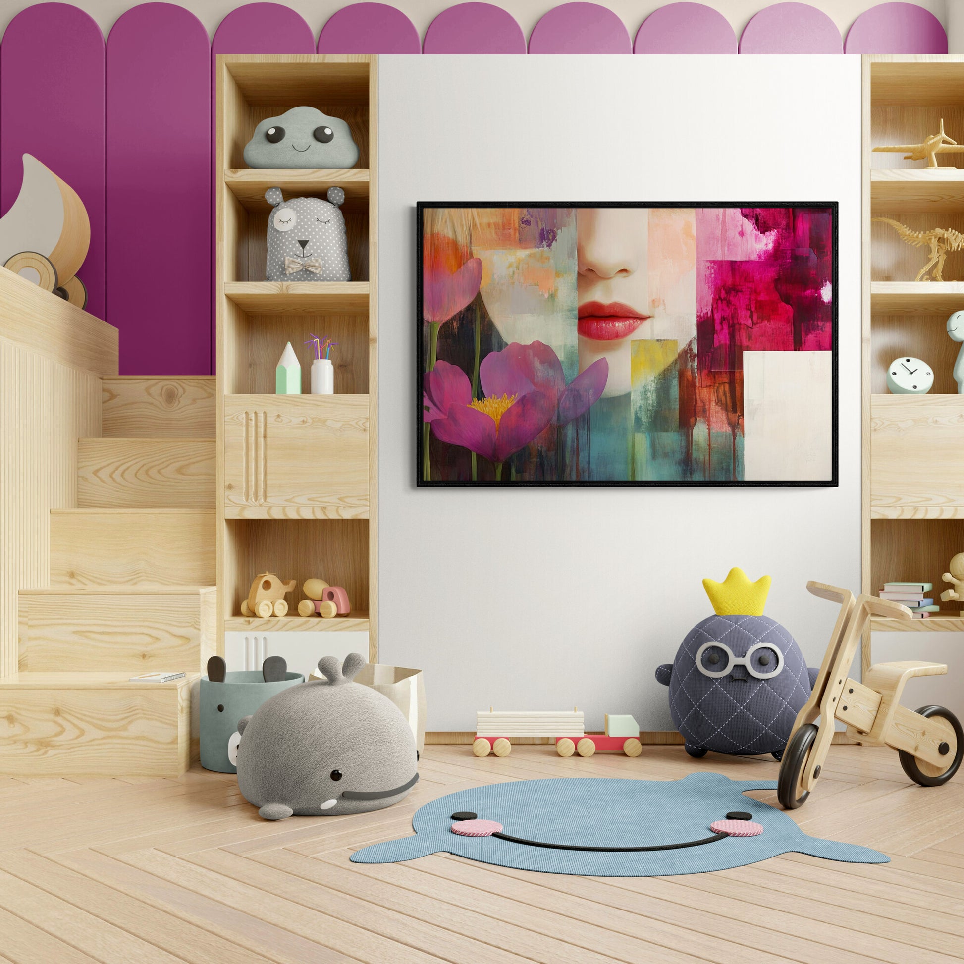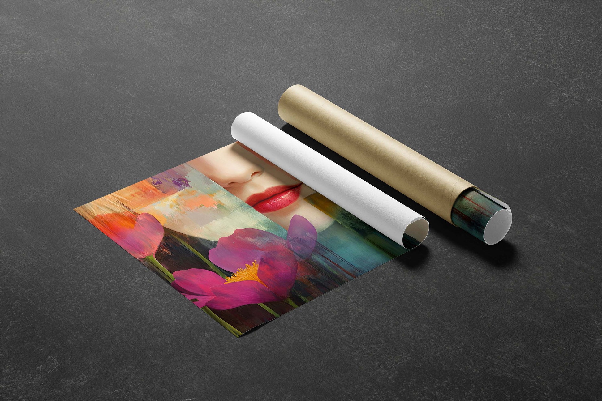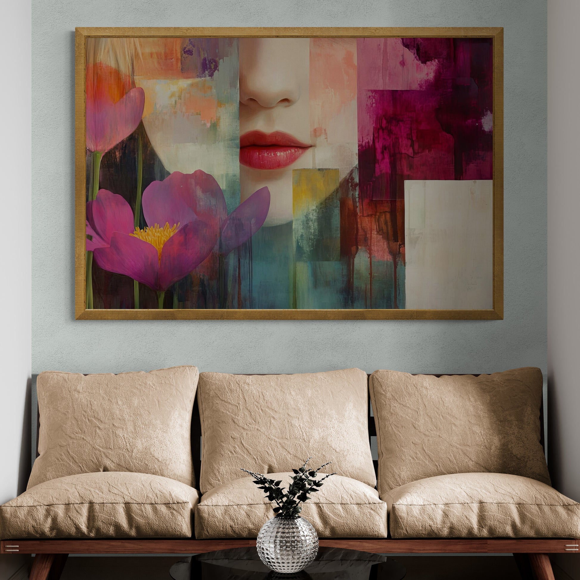 Ein fragmentiertes Porträt einer Frau, bei dem nur Nase und rote Lippen sichtbar sind, verschmilzt mit abstrakten Farbflächen und floralen Elementen. Die Komposition ist eine Kombination aus digitaler Malerei und Collage-Technik. Dominant sind kräftige Rosa-, Rot- und Violetttöne, kontrastiert von türkisgrünen und gelblichen Strukturen. Drei blühende Mohnblumen im Vordergrund unterstreichen die sinnliche, fast träumerische Atmosphäre des Bildes.