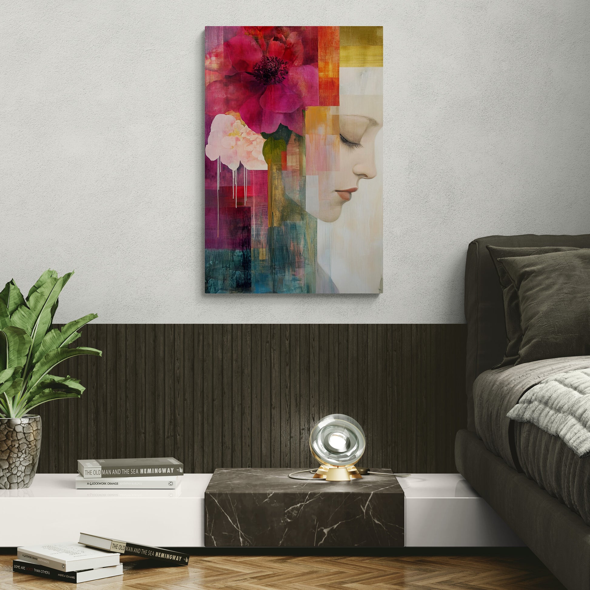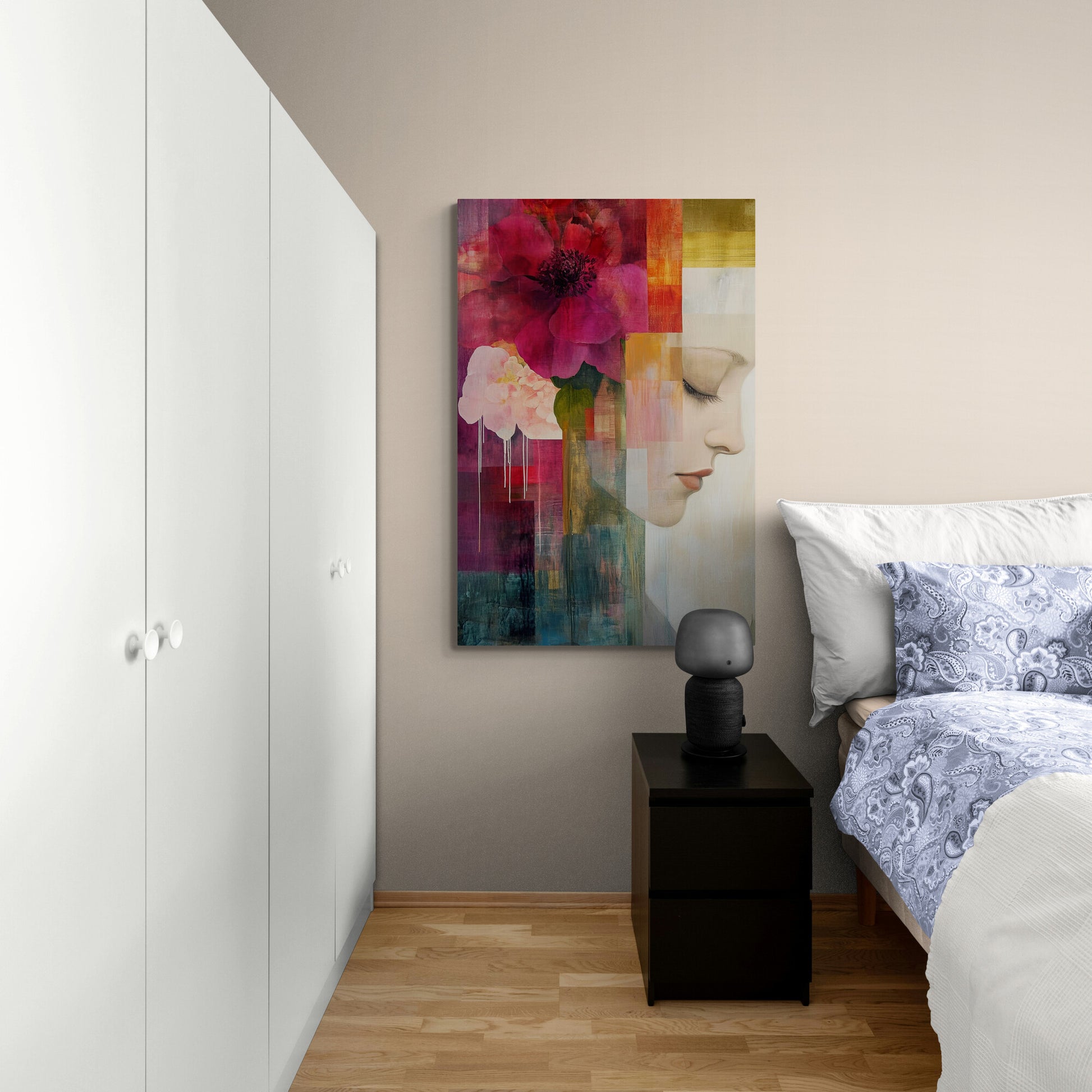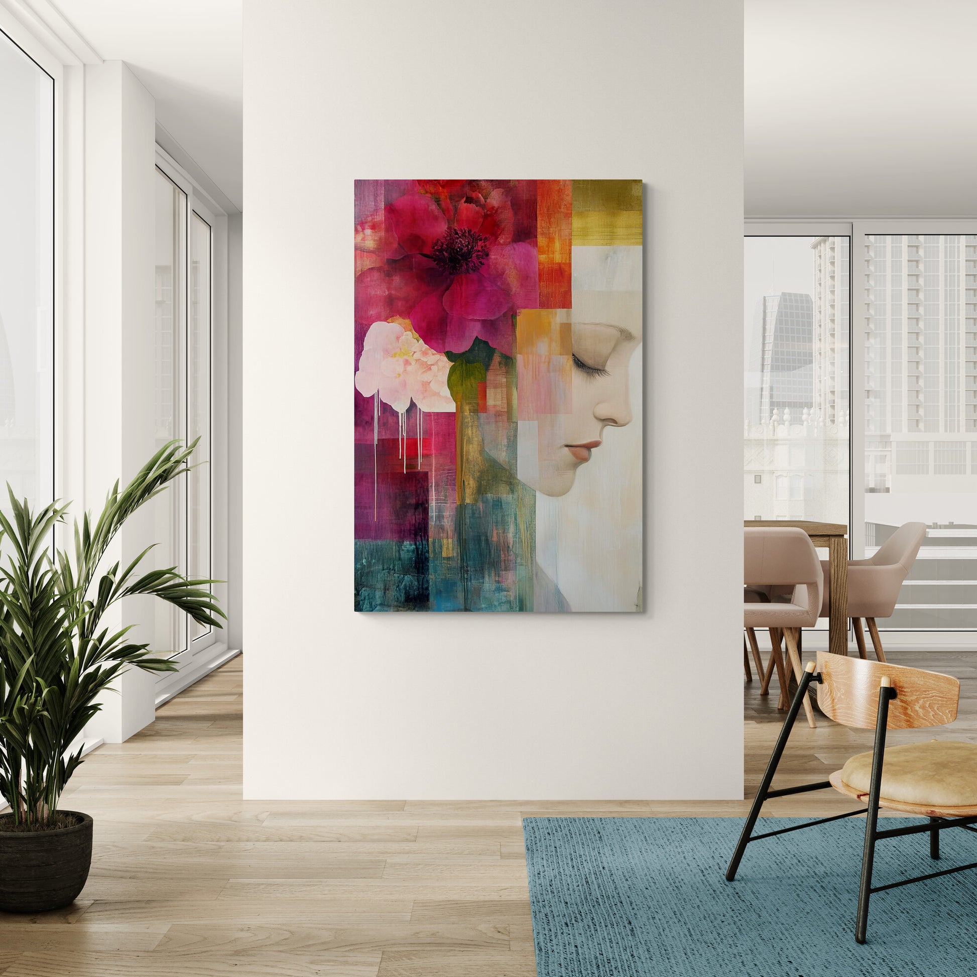 Ein poetisches Porträt im Profil: Das Gesicht einer jungen Frau mit geschlossenen Augen wirkt friedlich und introspektiv. Ihr Kopf geht nahtlos in eine Collage aus floralen und abstrakten Elementen über – leuchtende Blüten in Magenta und Rosa, ergänzt durch warme Orange- und kühle Grüntöne. Die Bildkomposition verbindet natürliche Anmut mit moderner Abstraktion und wirkt trotz der kräftigen Farben ruhig und harmonisch. Die Übergänge zwischen Flächen und Formen sind mal fließend, mal hartkantig, was dem Werk zusätzliche Spannung verleiht.