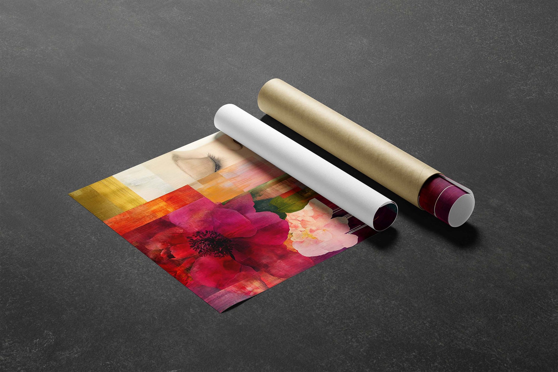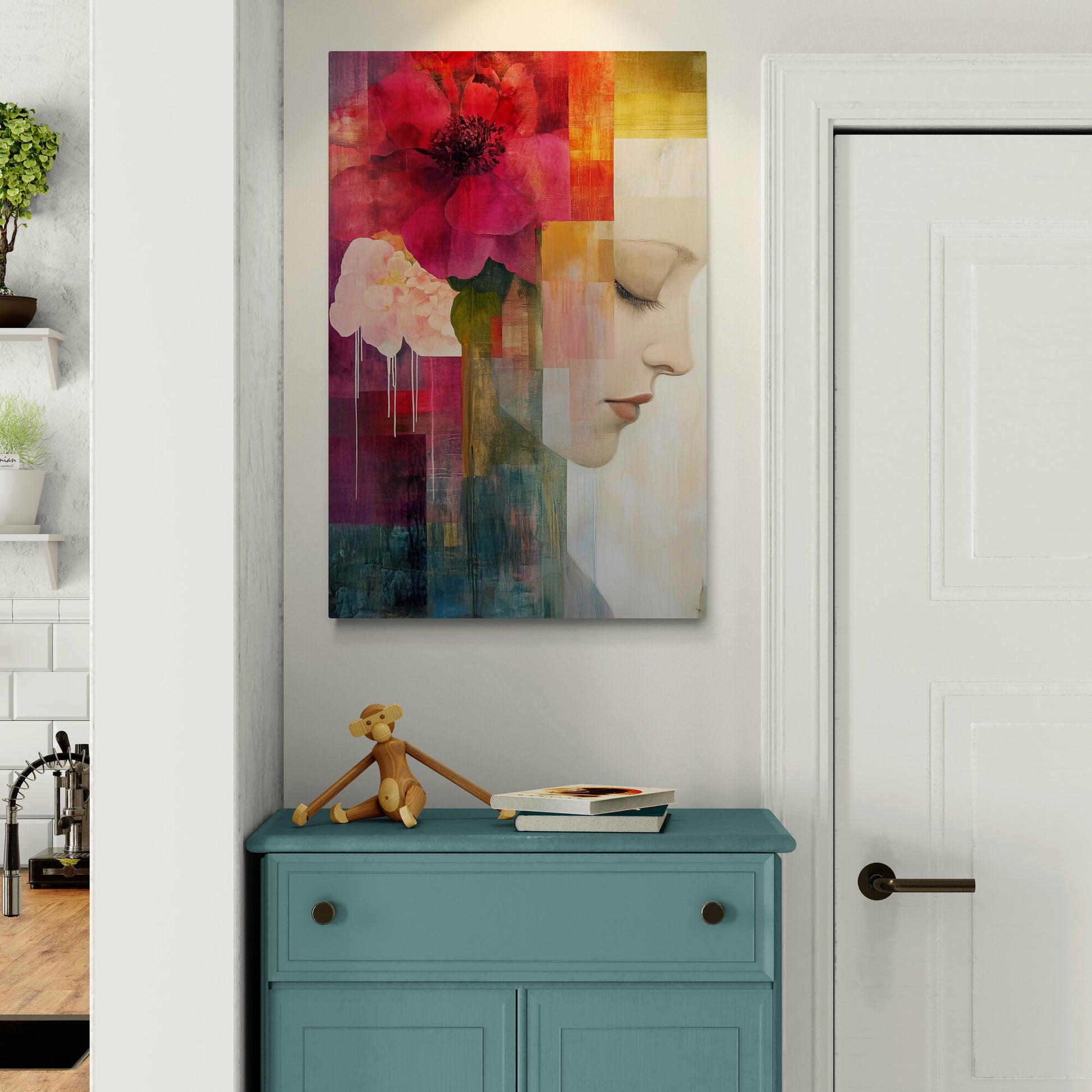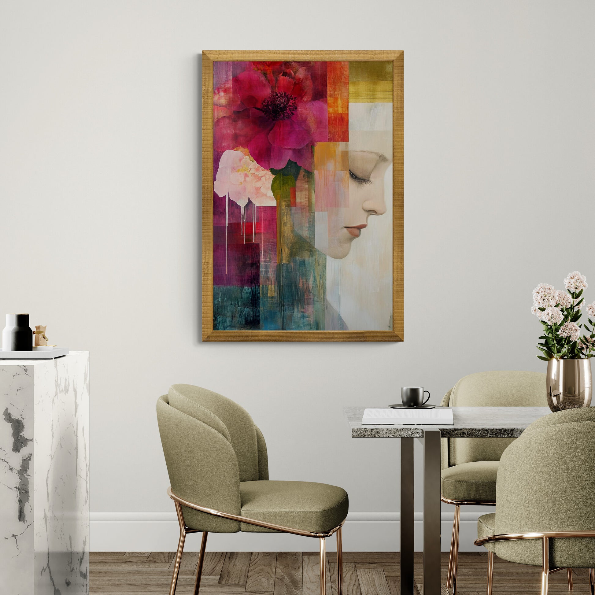 Ein poetisches Porträt im Profil: Das Gesicht einer jungen Frau mit geschlossenen Augen wirkt friedlich und introspektiv. Ihr Kopf geht nahtlos in eine Collage aus floralen und abstrakten Elementen über – leuchtende Blüten in Magenta und Rosa, ergänzt durch warme Orange- und kühle Grüntöne. Die Bildkomposition verbindet natürliche Anmut mit moderner Abstraktion und wirkt trotz der kräftigen Farben ruhig und harmonisch. Die Übergänge zwischen Flächen und Formen sind mal fließend, mal hartkantig, was dem Werk zusätzliche Spannung verleiht.