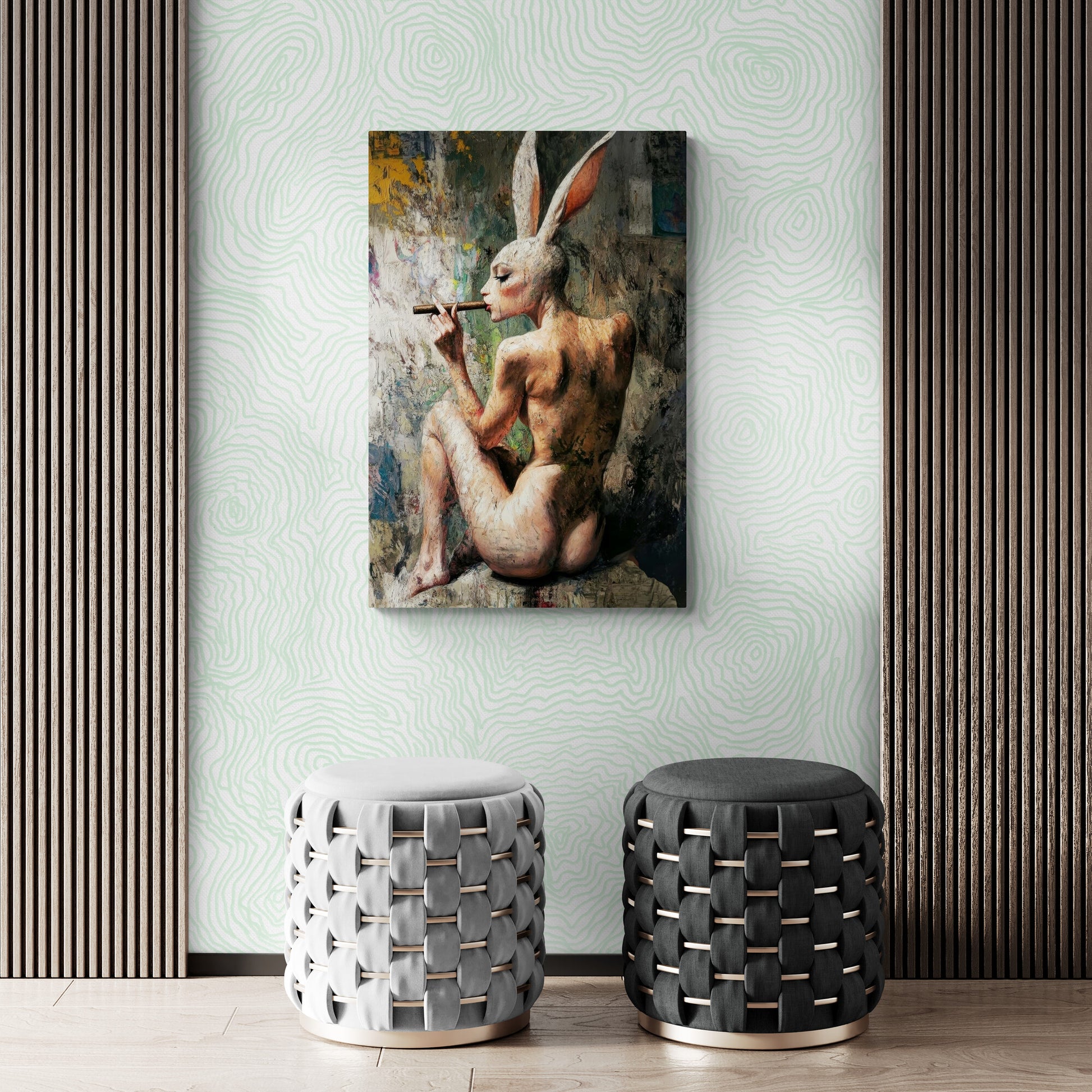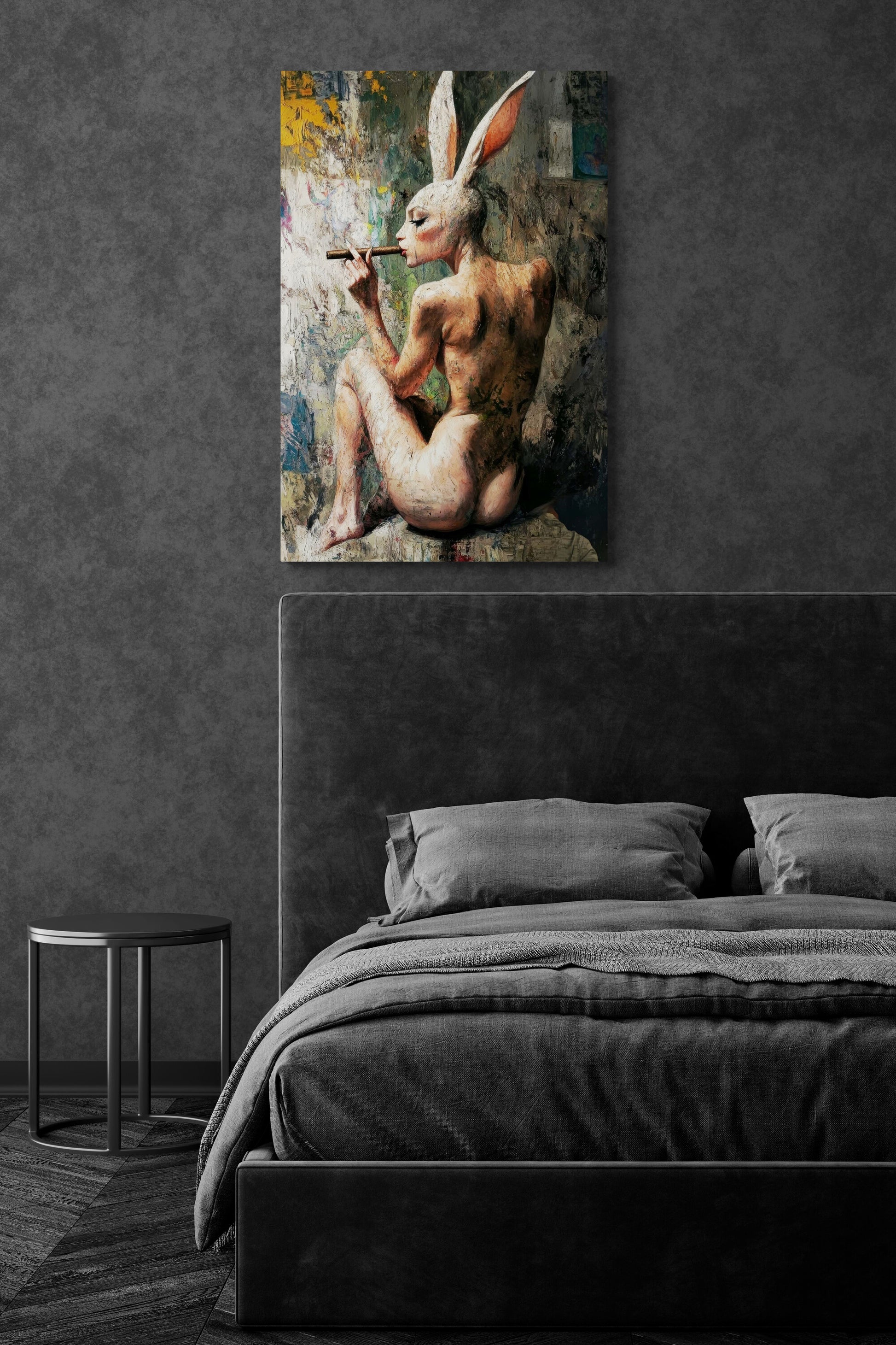 Eine nackte weibliche Figur mit Hasenkopf und langen, aufgerichteten Ohren sitzt auf einem Steinblock und raucht genüsslich eine Zigarre. Der Körper ist detailreich in pastosen, teils groben Pinselstrukturen gemalt, was dem Motiv eine starke Haptik verleiht. Die Pose ist entspannt und zugleich selbstbewusst. Der Hintergrund ist abstrakt und farblich vielschichtig, mit dominanten Tönen in Grau, Grün und Ocker. Die Atmosphäre wirkt surreal, mit einem subtilen ironischen Unterton – eine erotische Fantasiefigur im Spannungsfeld zwischen Animalität und Eleganz.