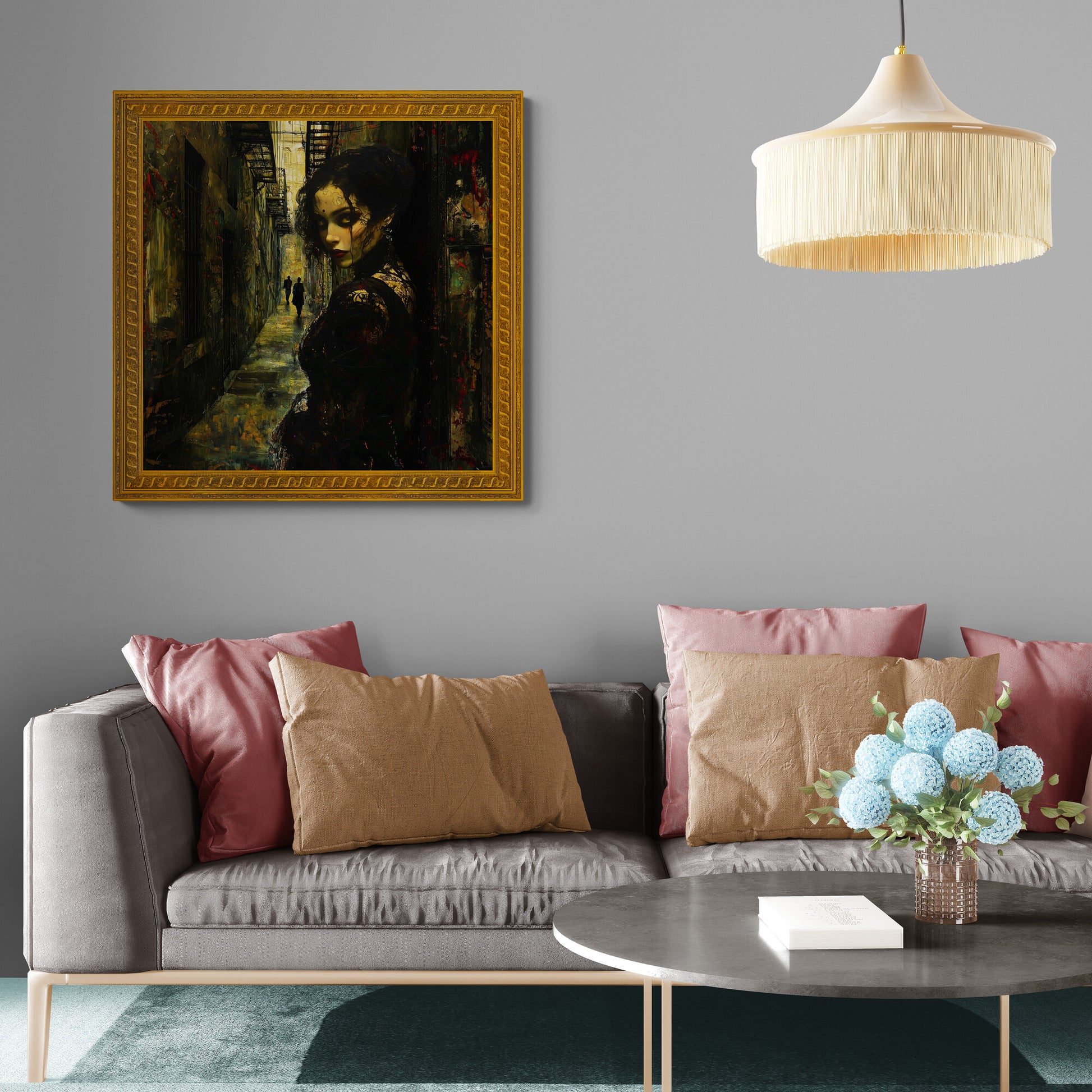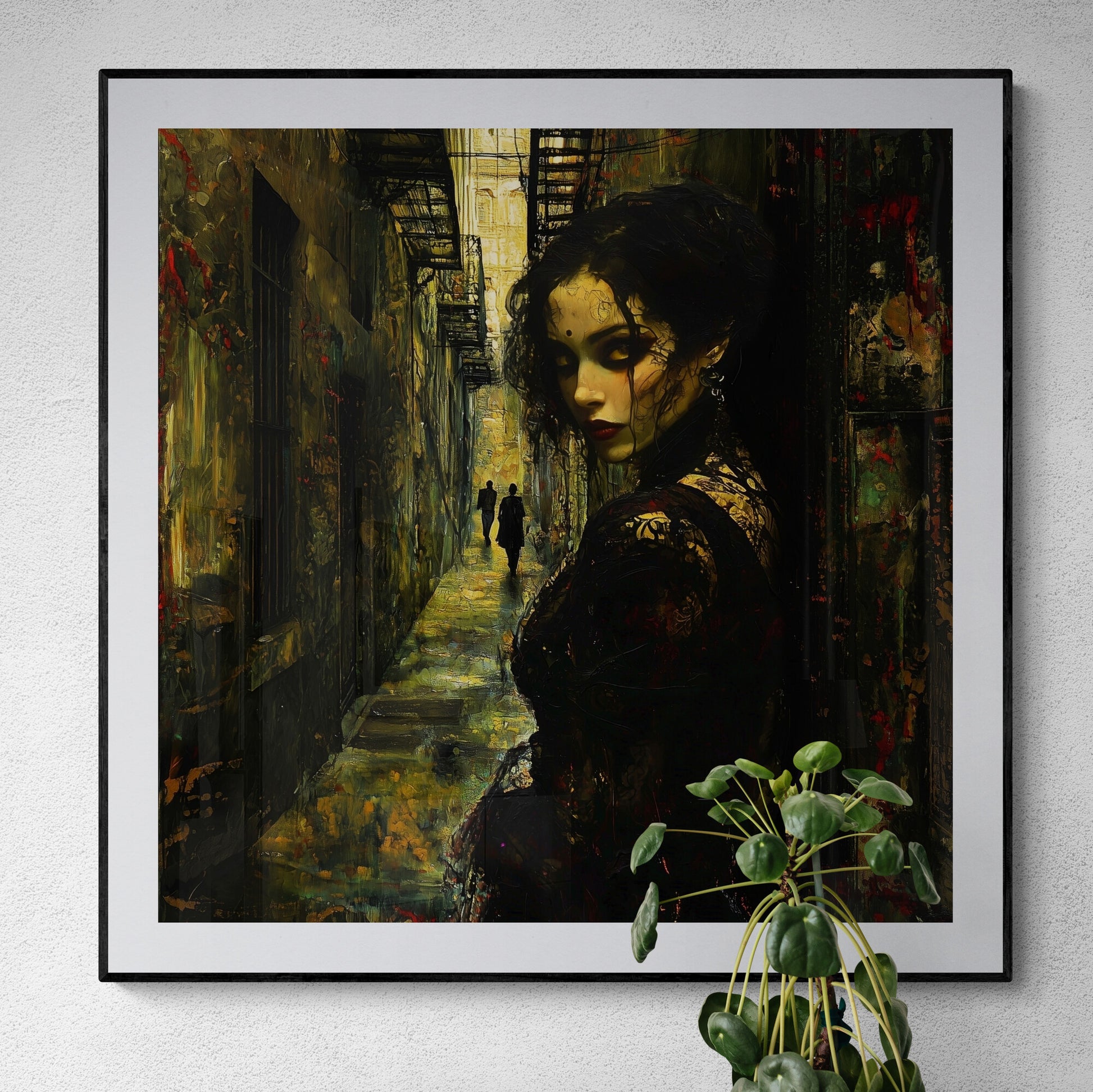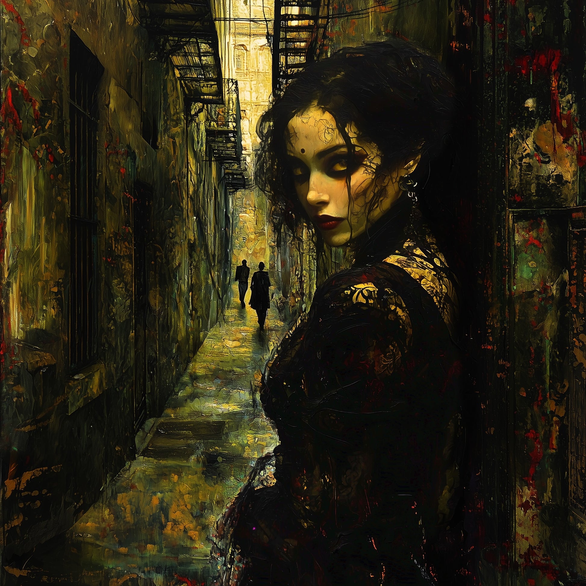 Ein schmaler Gang, getränkt von goldenem Laternenlicht, feucht glänzend wie ein nachtschwerer Traum. Aus der Tiefe der Gasse treten Schatten hervor, doch der Blick bleibt an ihr hängen: die „Spanish Beauty“. Schwarz gekleidet, als wäre ihr Körper ein Geflecht aus Spitze und Dunkelheit, trägt sie die Aura einer Königin, die längst das Reich der Lebenden hinter sich gelassen hat.
