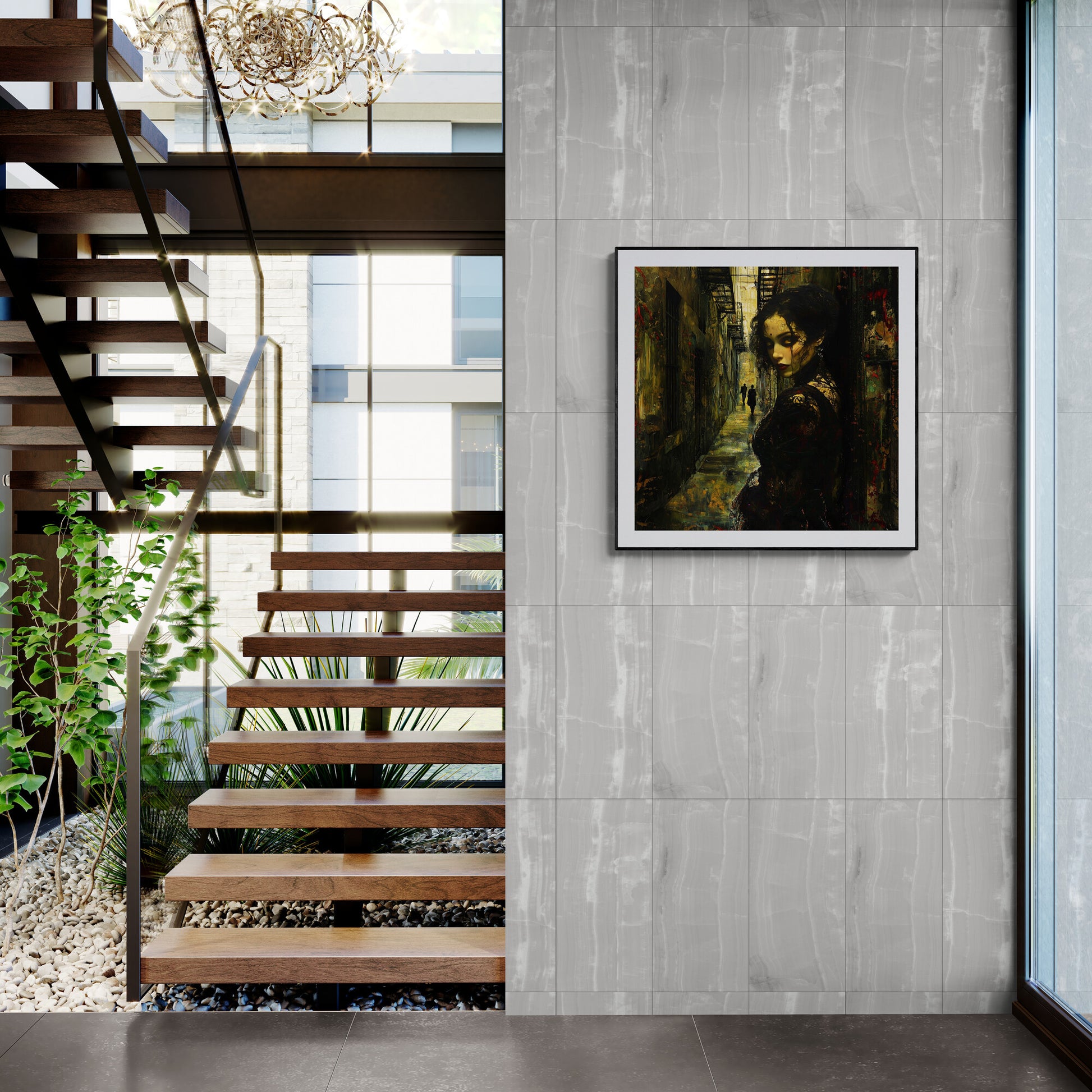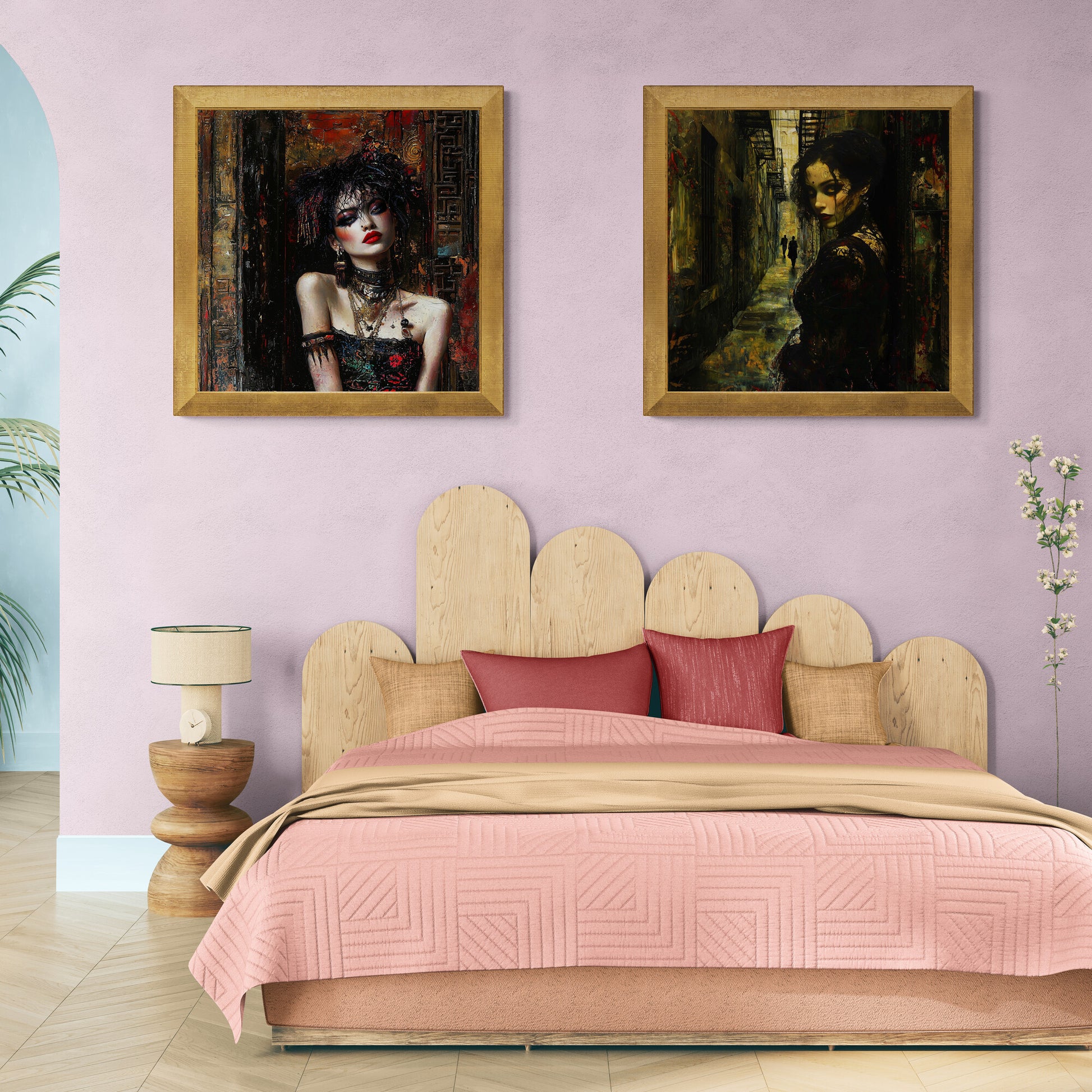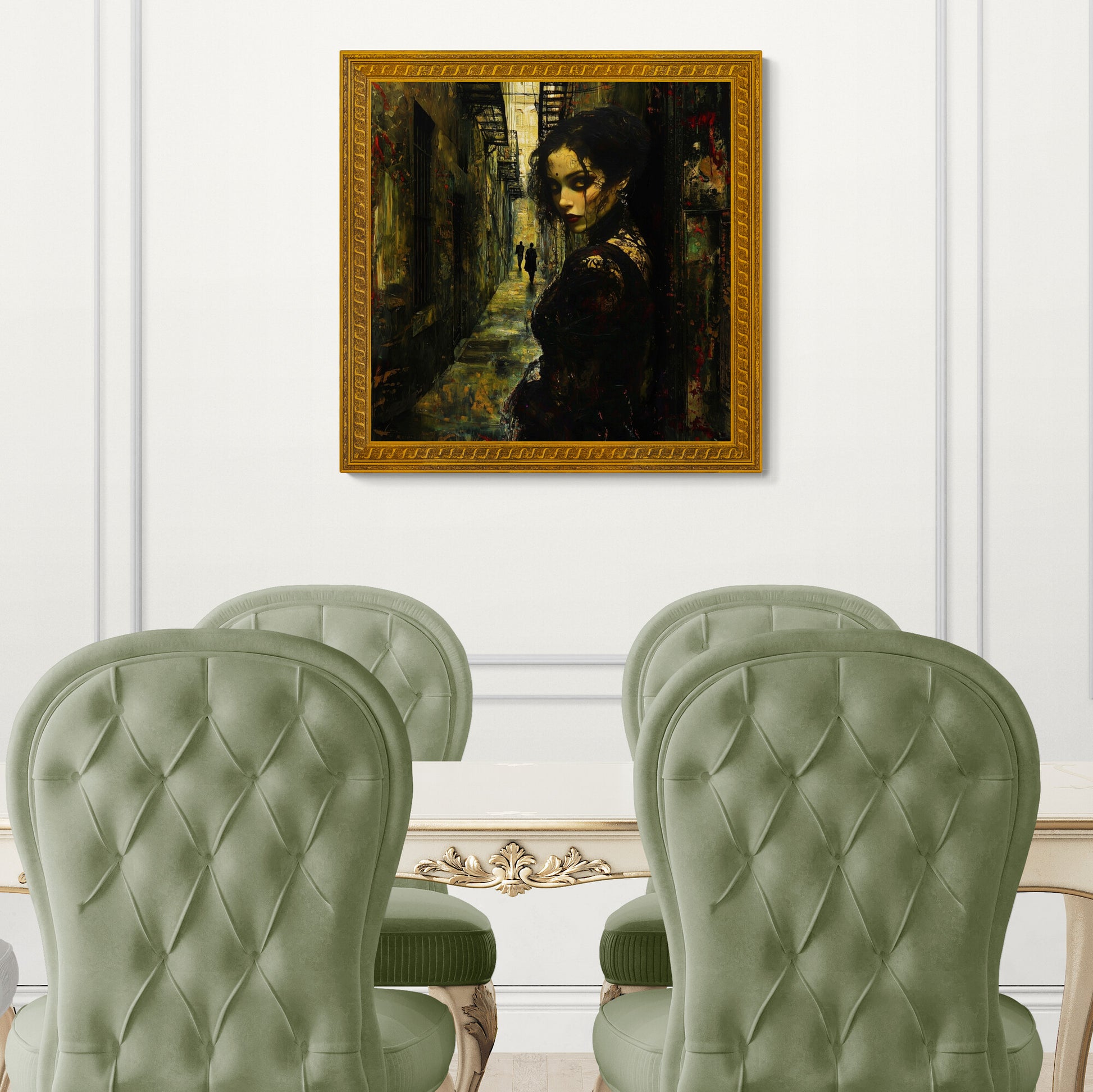 Ein schmaler Gang, getränkt von goldenem Laternenlicht, feucht glänzend wie ein nachtschwerer Traum. Aus der Tiefe der Gasse treten Schatten hervor, doch der Blick bleibt an ihr hängen: die „Spanish Beauty“. Schwarz gekleidet, als wäre ihr Körper ein Geflecht aus Spitze und Dunkelheit, trägt sie die Aura einer Königin, die längst das Reich der Lebenden hinter sich gelassen hat.