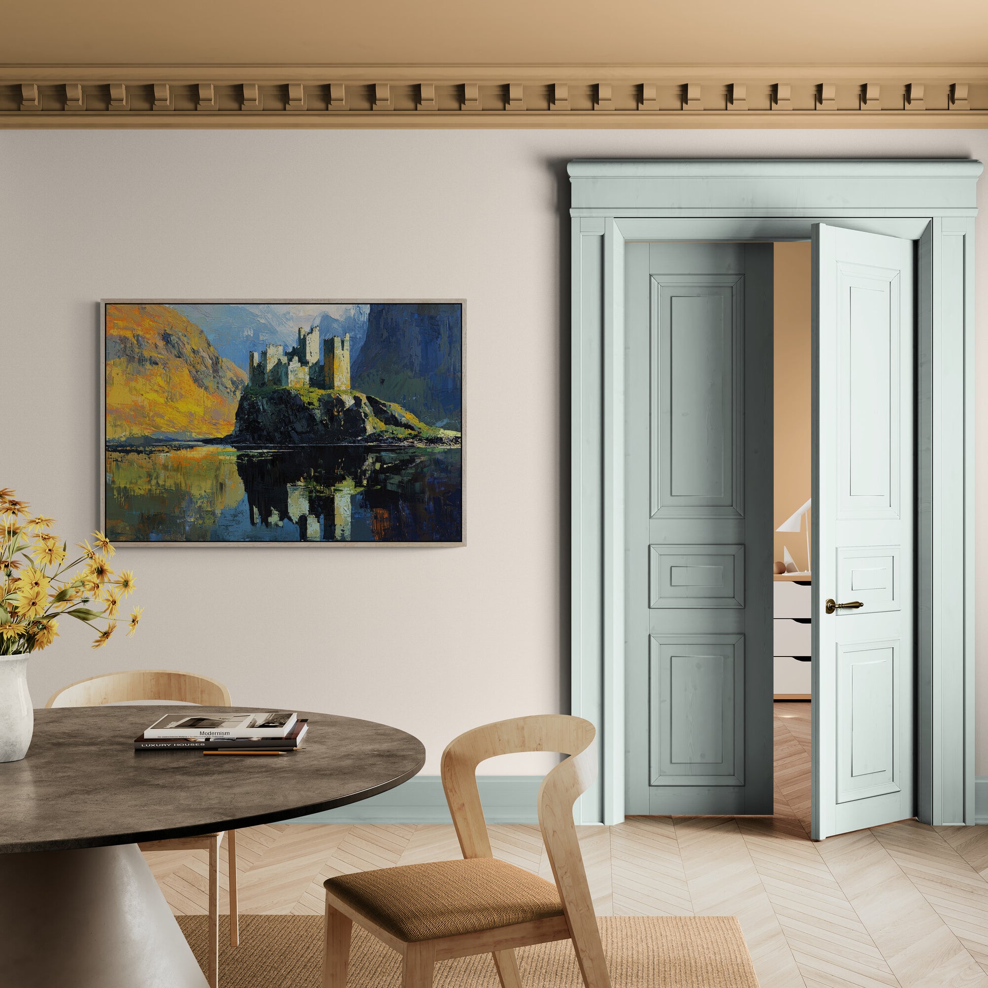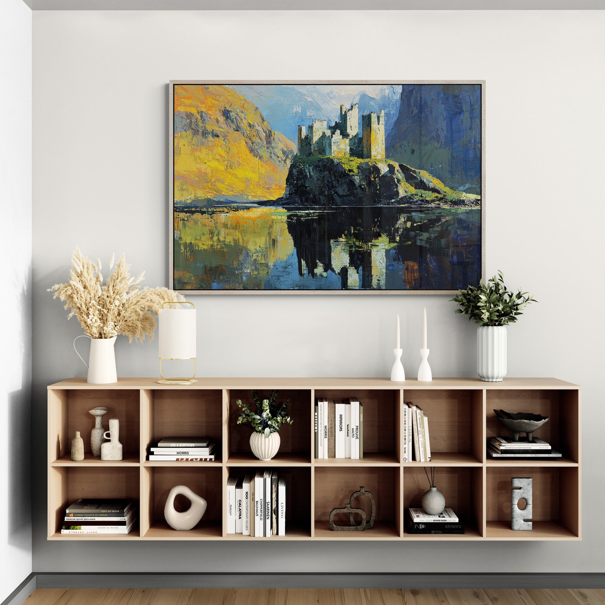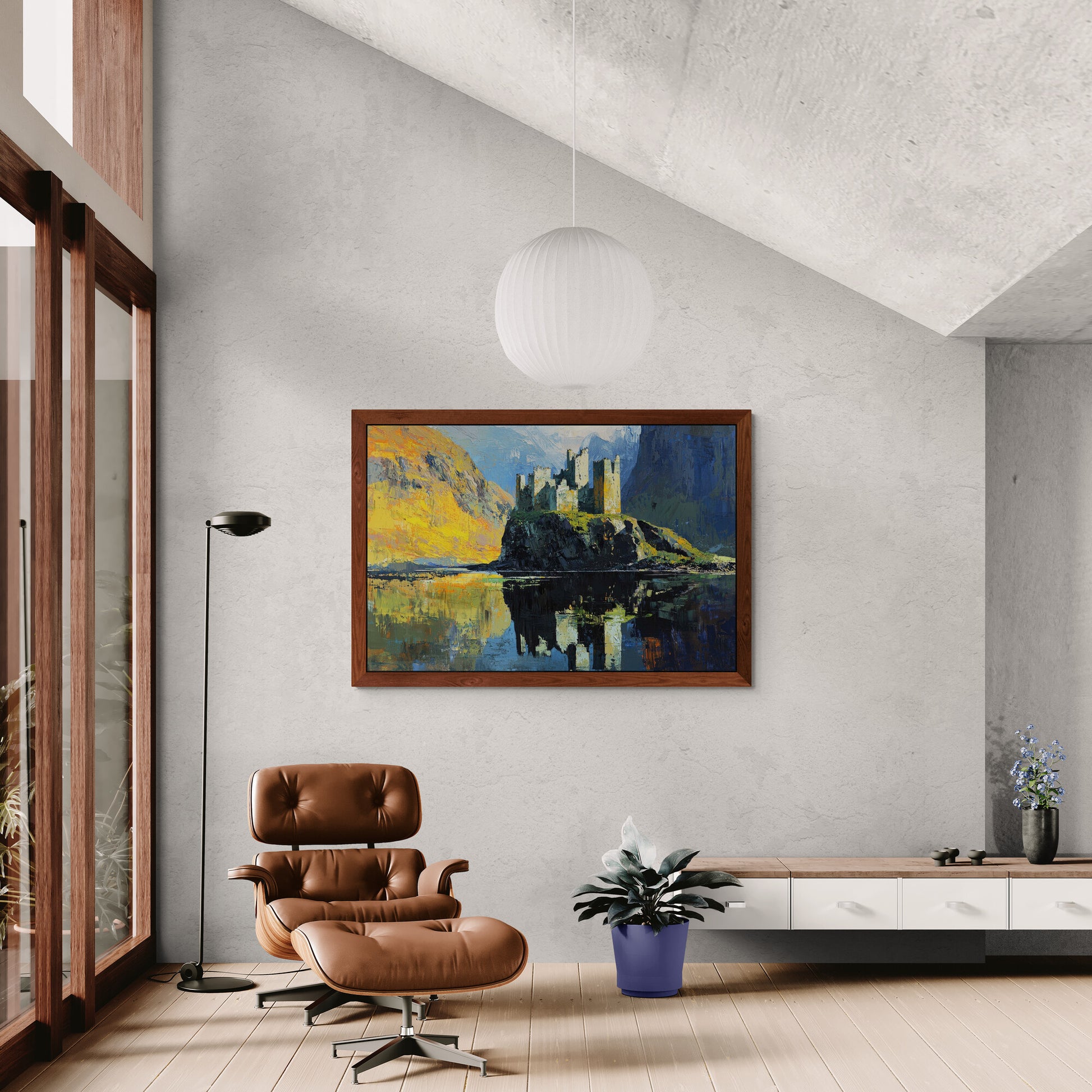Ein massives, verwittertes Schloss thront auf einem steilen Felsen über einem stillen See. Die Szene ist in einem pastosen, impressionistisch anmutenden Stil gemalt, mit sichtbaren Pinselstrukturen und kräftigen Farben. Die herbstlich leuchtenden Hügel im Hintergrund kontrastieren mit dem dunklen Felsen und dem hellen Stein des Schlosses. Die Spiegelung im Wasser verstärkt die dramatische Wirkung der Komposition und verleiht dem Bild eine ruhige, fast mystische Atmosphäre.
