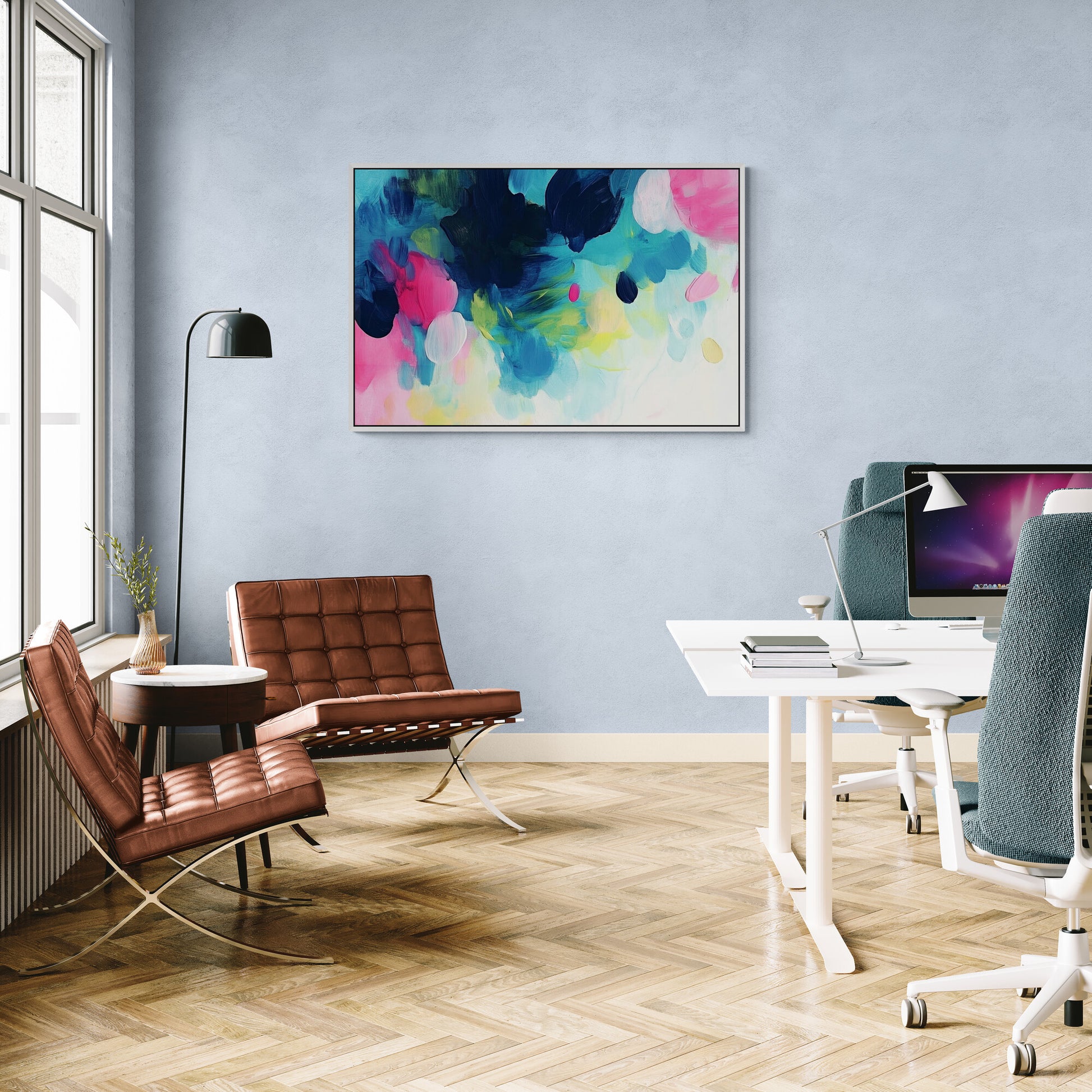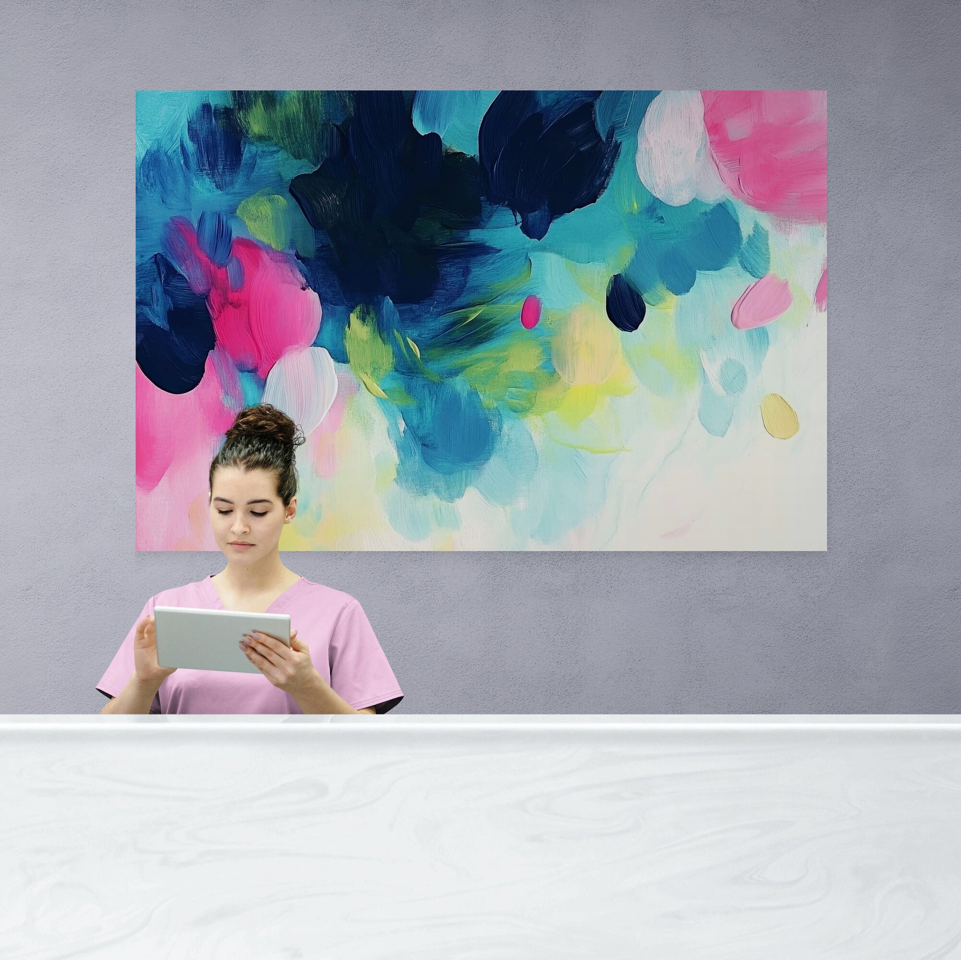 Ein lebendiges abstraktes Gemälde in expressivem Pinselduktus. Dunkle Blautöne und Türkis dominieren die obere Bildhälfte, während leuchtende Pink-, Grün- und Gelbtöne weiche Akzente in der unteren Hälfte setzen. Die großzügig gesetzten Farbflecken wirken dynamisch und ungebändigt, fast wie in Bewegung. Die Komposition erinnert an ein subtiles Farbenspiel unter Wasser oder an abstrakte Blütenformen im Wind. Die Farben überlappen sich leicht und schaffen dadurch Tiefe und Spannung.